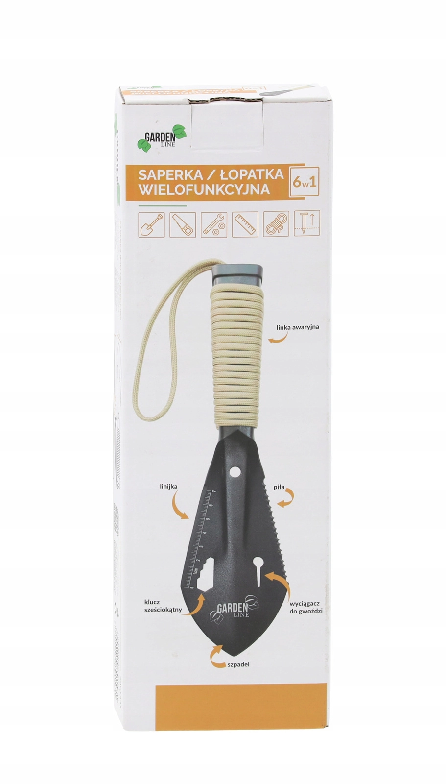 • 6 outils en un : pelle, scie, arrache-clous, clé hexagonale, règle, corde de secours