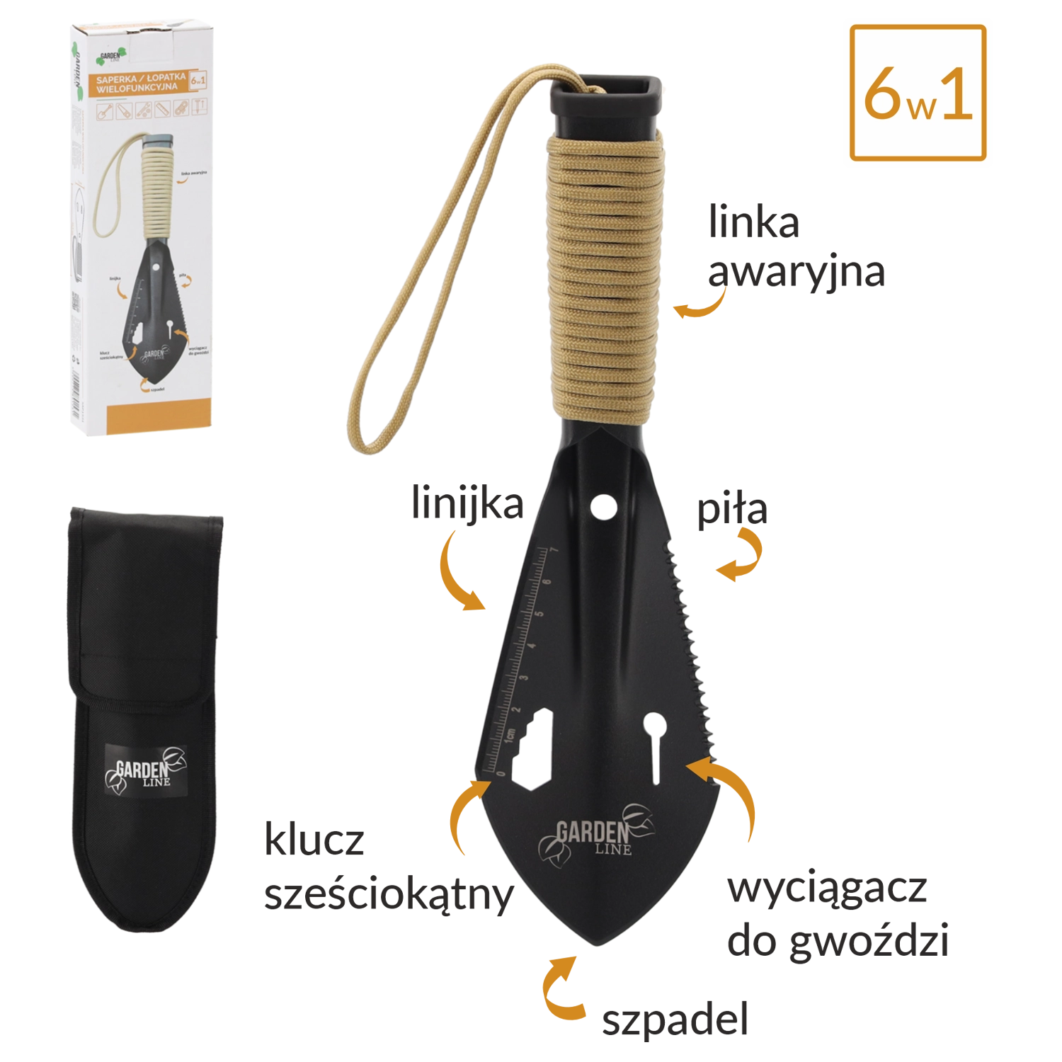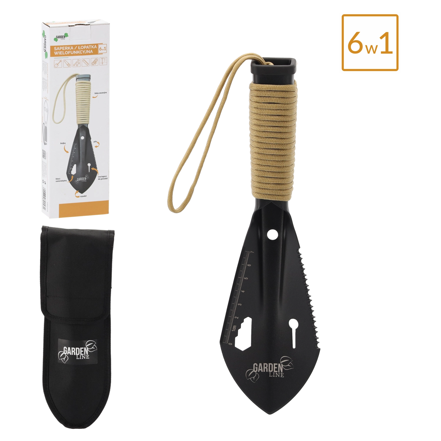 Pelle multifonction 6‑en‑1 compacte et légère pour le camping, la survie, le jardin et la voiture. Elle offre une construction pliante, une acier inoxydable robuste et un étui pratique pour le transport. En un seul outil, vous obtenez une pelle, une scie, un arrache-clous, une clé hexagonale, une règle et une corde paracorde de secours – l’équipement idéal pour le terrain.