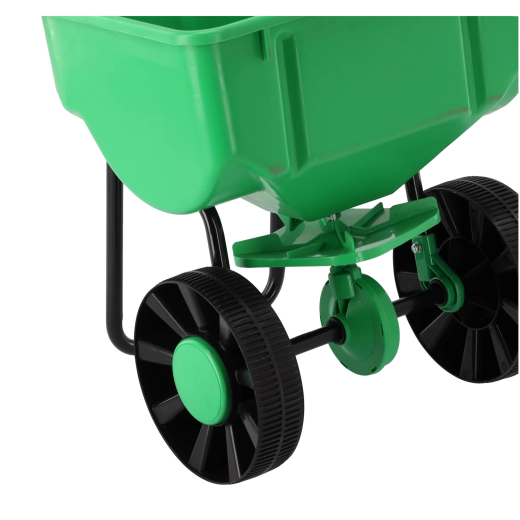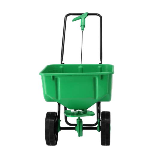 Les grandes roues assurent un déplacement fluide et une bonne stabilité, tandis que le levier près de la poignée permet un réglage précis du débit pour une répartition homogène.