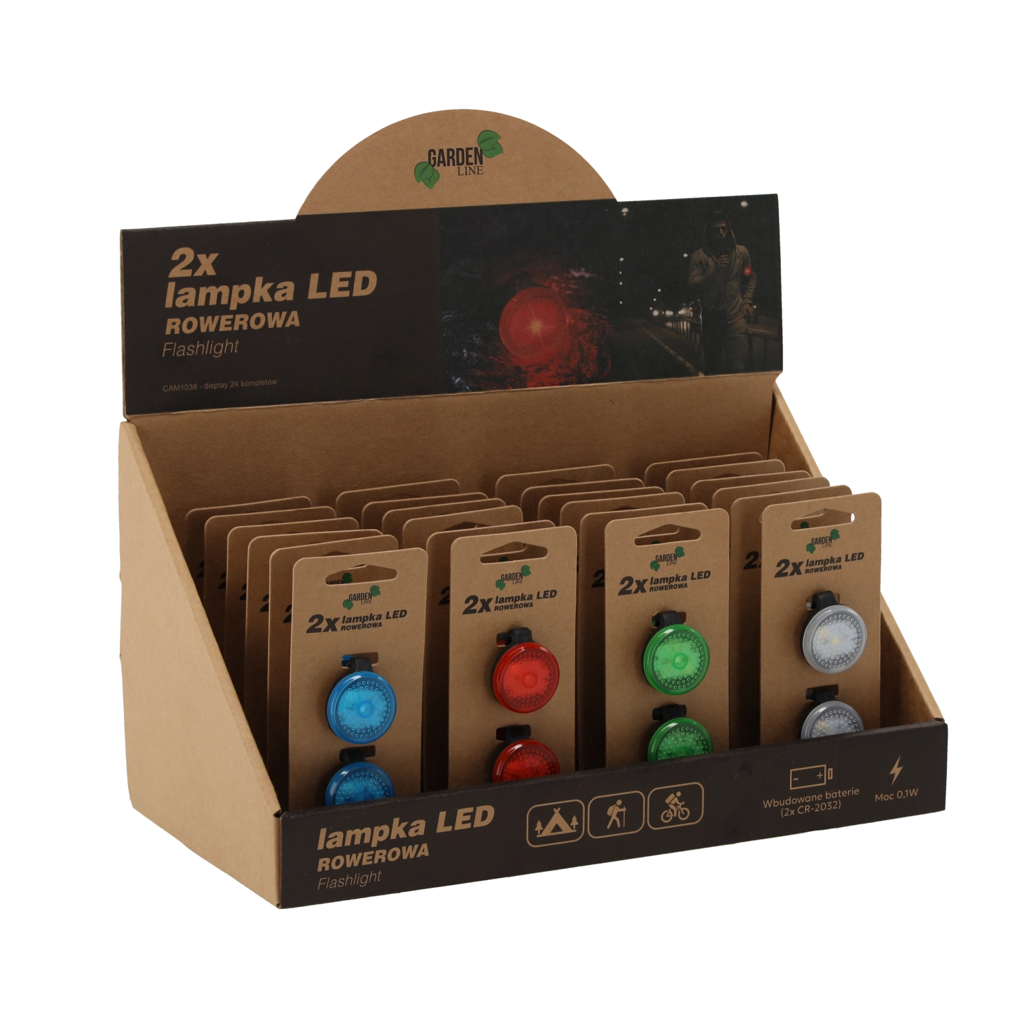 Le set est disponible en assortiment de couleurs : blanc, rouge, bleu et vert. Combinez le blanc à l’avant et le rouge à l’arrière pour une sécurité maximale.