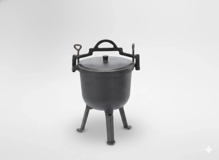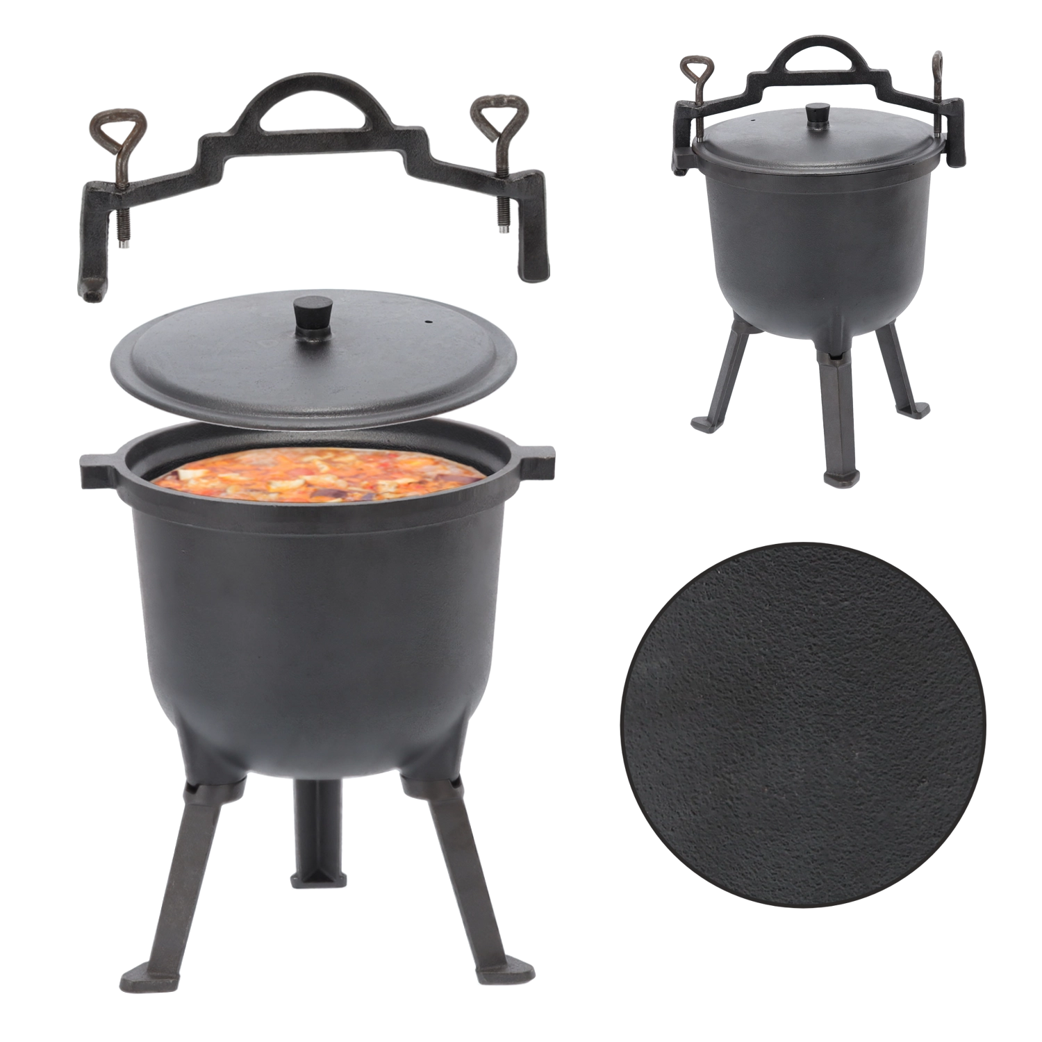 Trois pieds solides et un couvercle garantissent une cuisson sûre et confortable au-dessus de la flamme. L’anse permet un transport facile ou une suspension sur trépied.