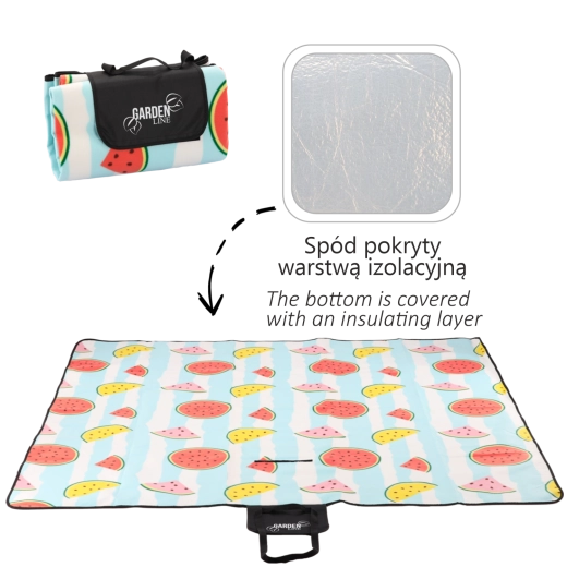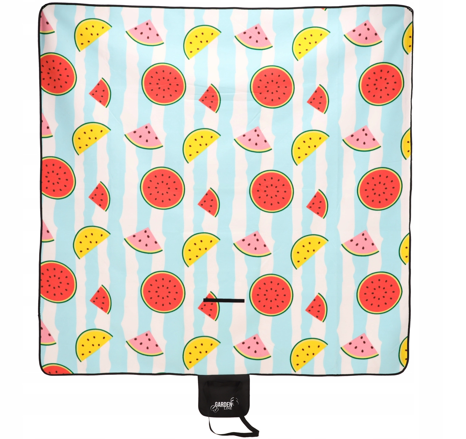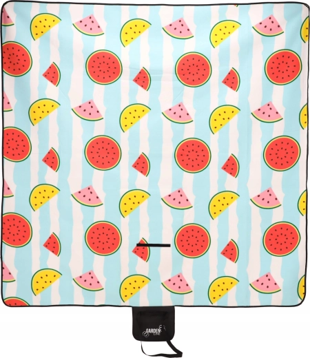 La couverture se plie facilement en un format compact et se ferme avec un rabat à velcro; l’anse et la sangle intégrées permettent un transport pratique. Le motif fruité moderne à pastèques se démarque à chaque pique-nique et ravira enfants et adultes.