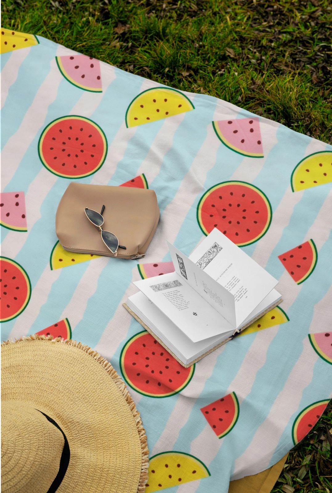Le format 200 × 200 cm offre assez de place pour toute la famille et le motif frais à pastèques apporte une ambiance estivale à chaque moment.