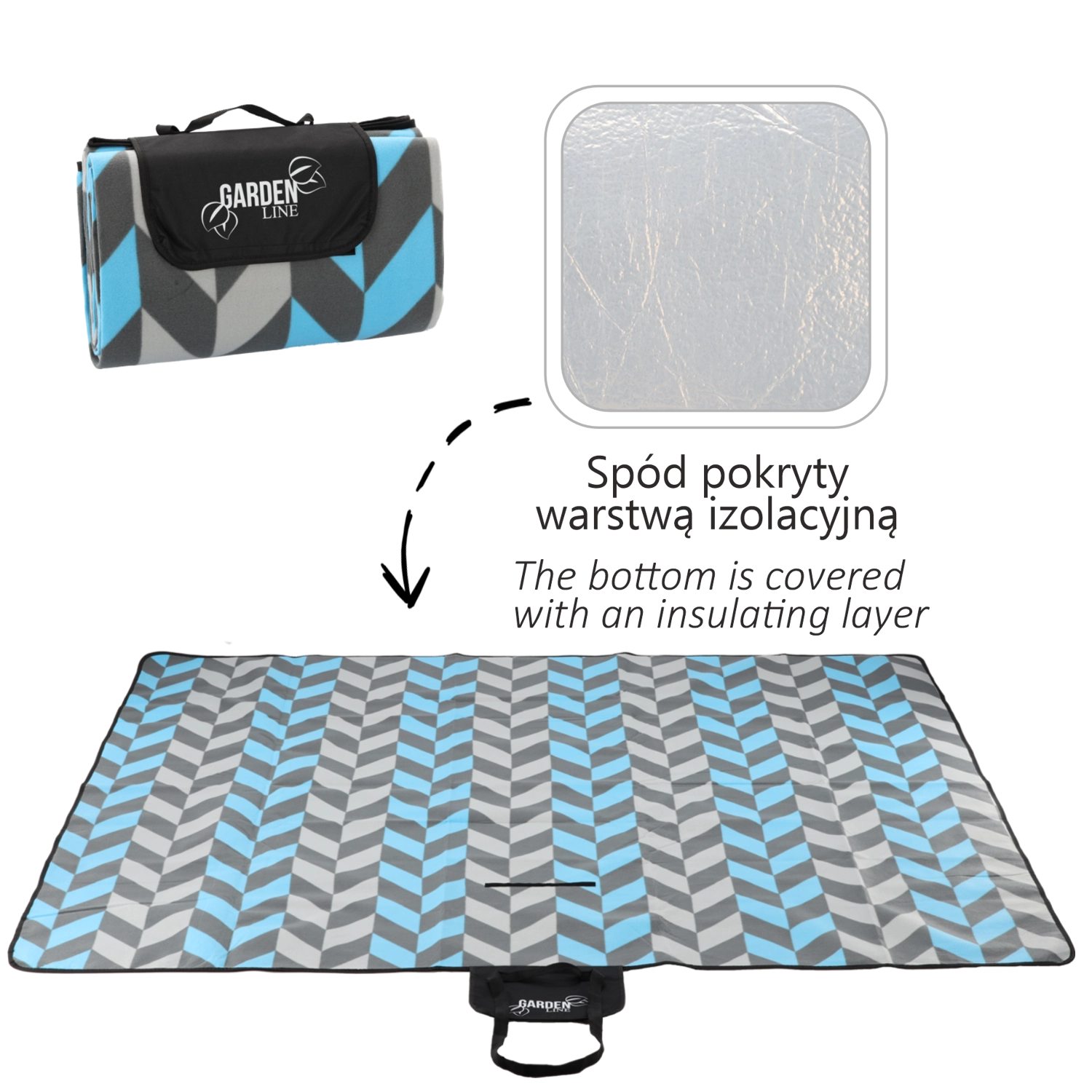 La couche aluminium argentée au-dessous protège de manière fiable contre l’humidité et le froid, pour profiter du pique-nique même sur une herbe humide de rosée.