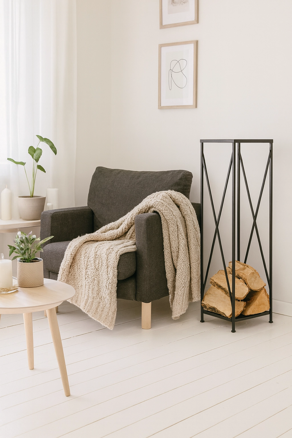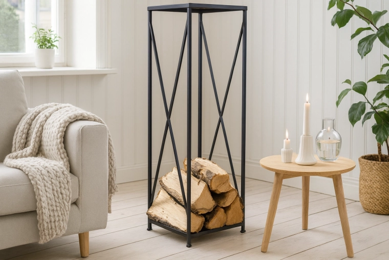 Un porte-bûches élégant et peu encombrant garde le bois à portée de main près de la cheminée. Grâce à sa structure en acier robuste, il offre une capacité de charge élevée jusqu’à 30 kg, une grande stabilité et une longue durée de vie. Son design moderne et élancé s’intègre à tout intérieur comme à une terrasse.