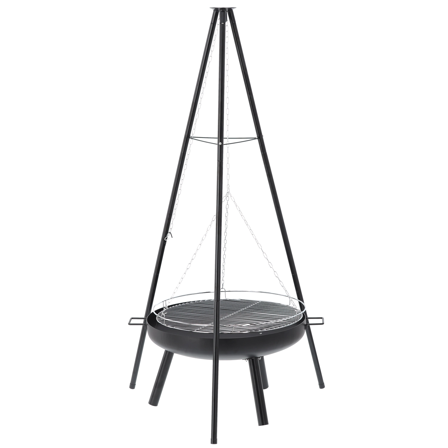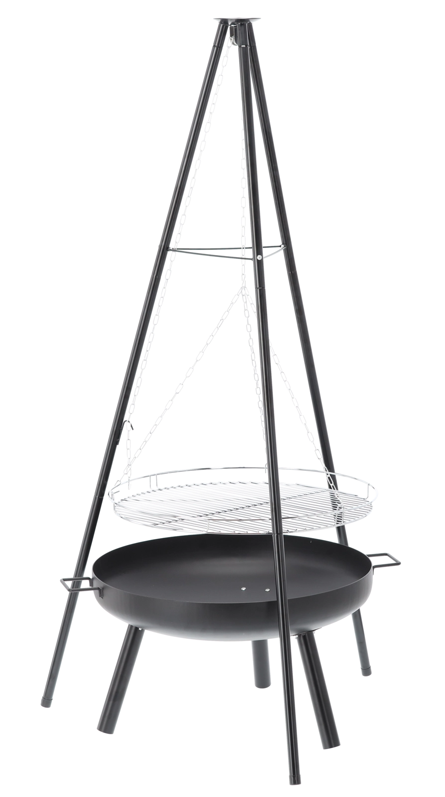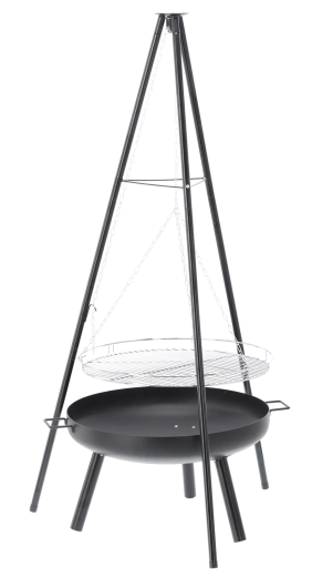 Solution 2‑en‑1 élégante : brasero et gril suspendu. Le bol en acier robuste de 2 mm d’épaisseur, avec une peinture noire résistante à la chaleur, garantit une longue durée de vie même en cas d’utilisation fréquente. Grâce à la grille suspendue sur chaînes, vous réglez aisément la distance au feu pour préparer viandes juteuses, légumes et brochettes exactement à votre goût.