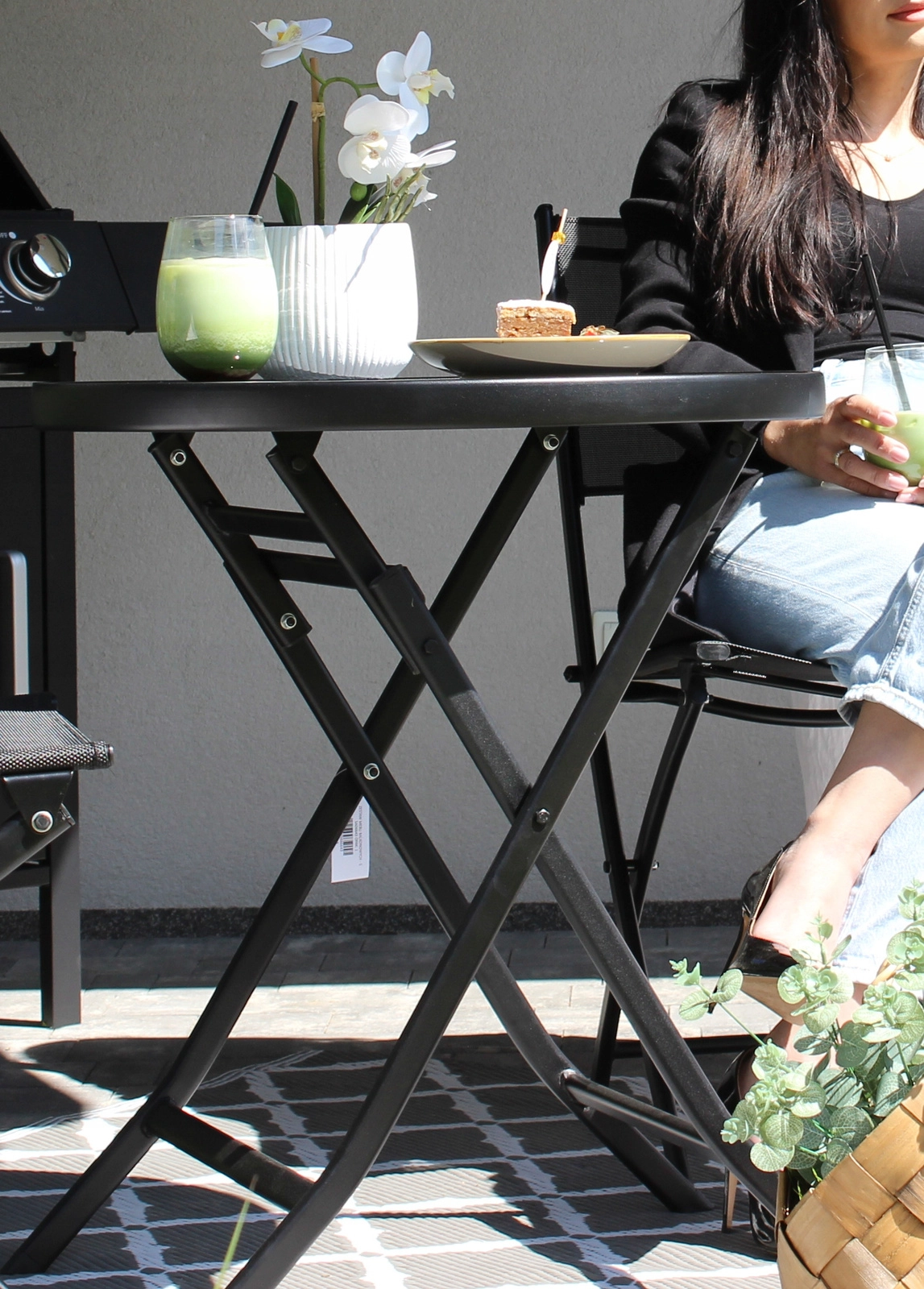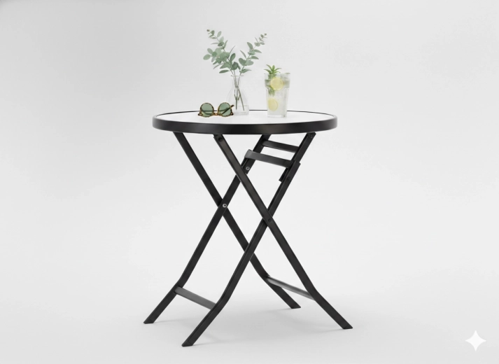 Les pieds croisés et le mécanisme pliant permettent un pliage rapide et un rangement ou transport compact, parfaits pour les balcons et petites terrasses.