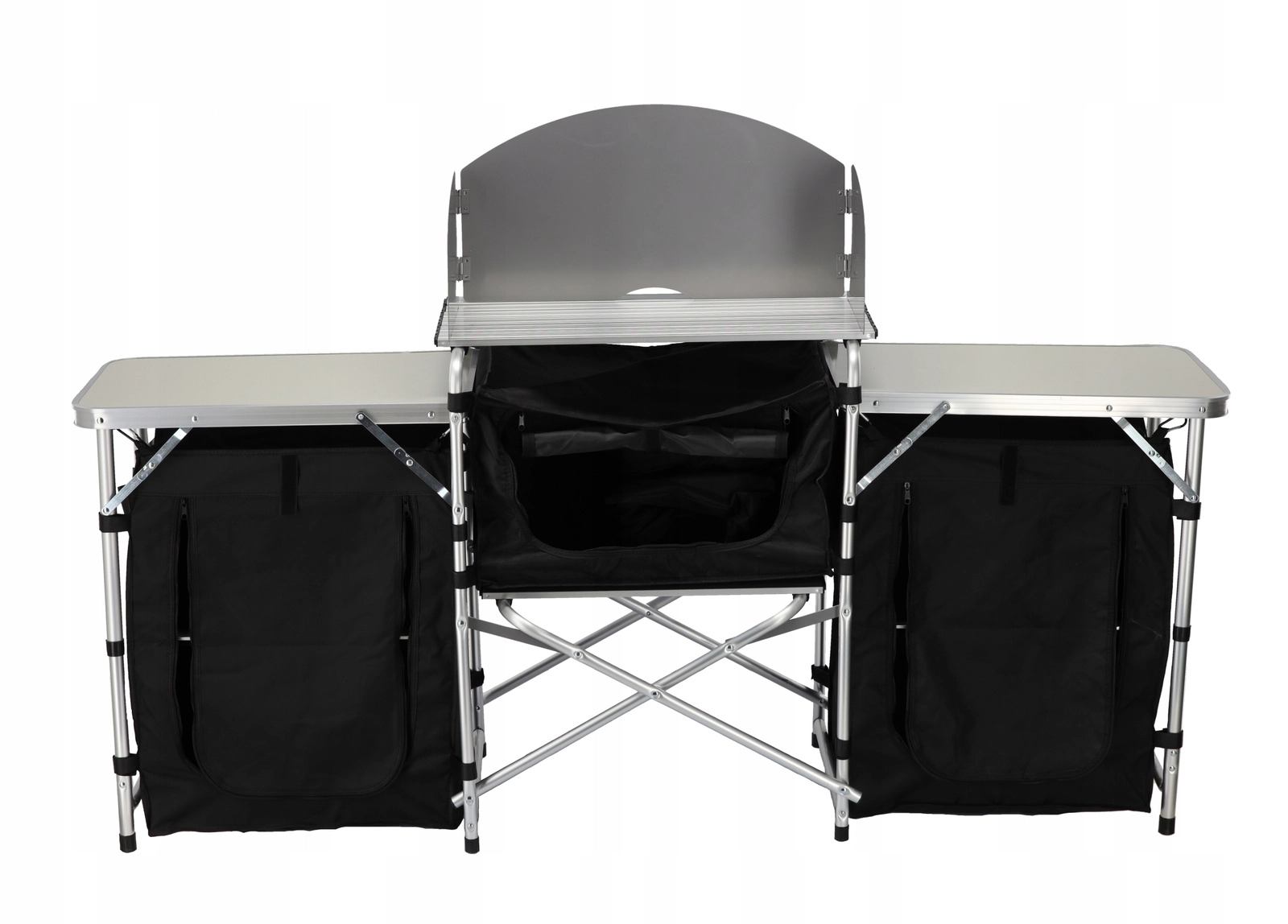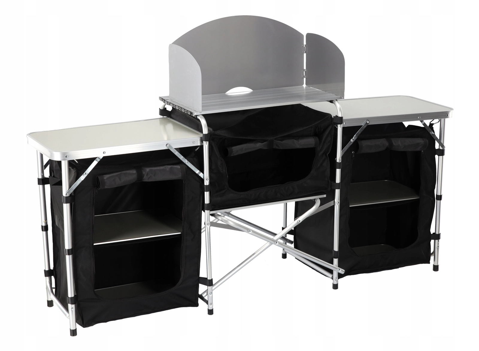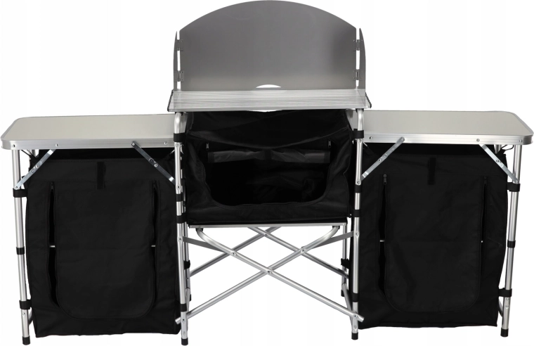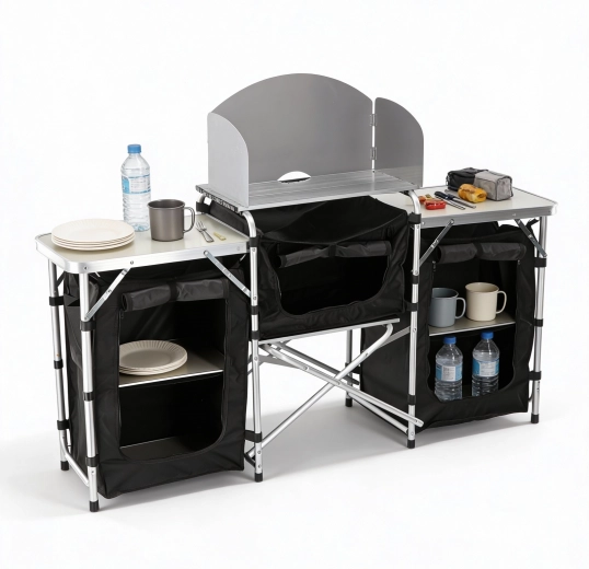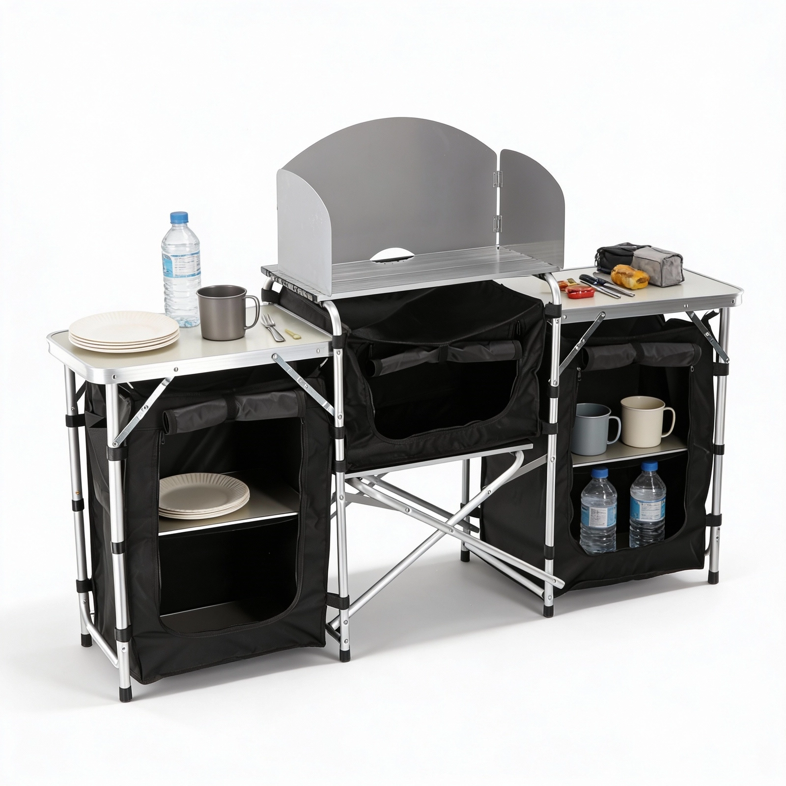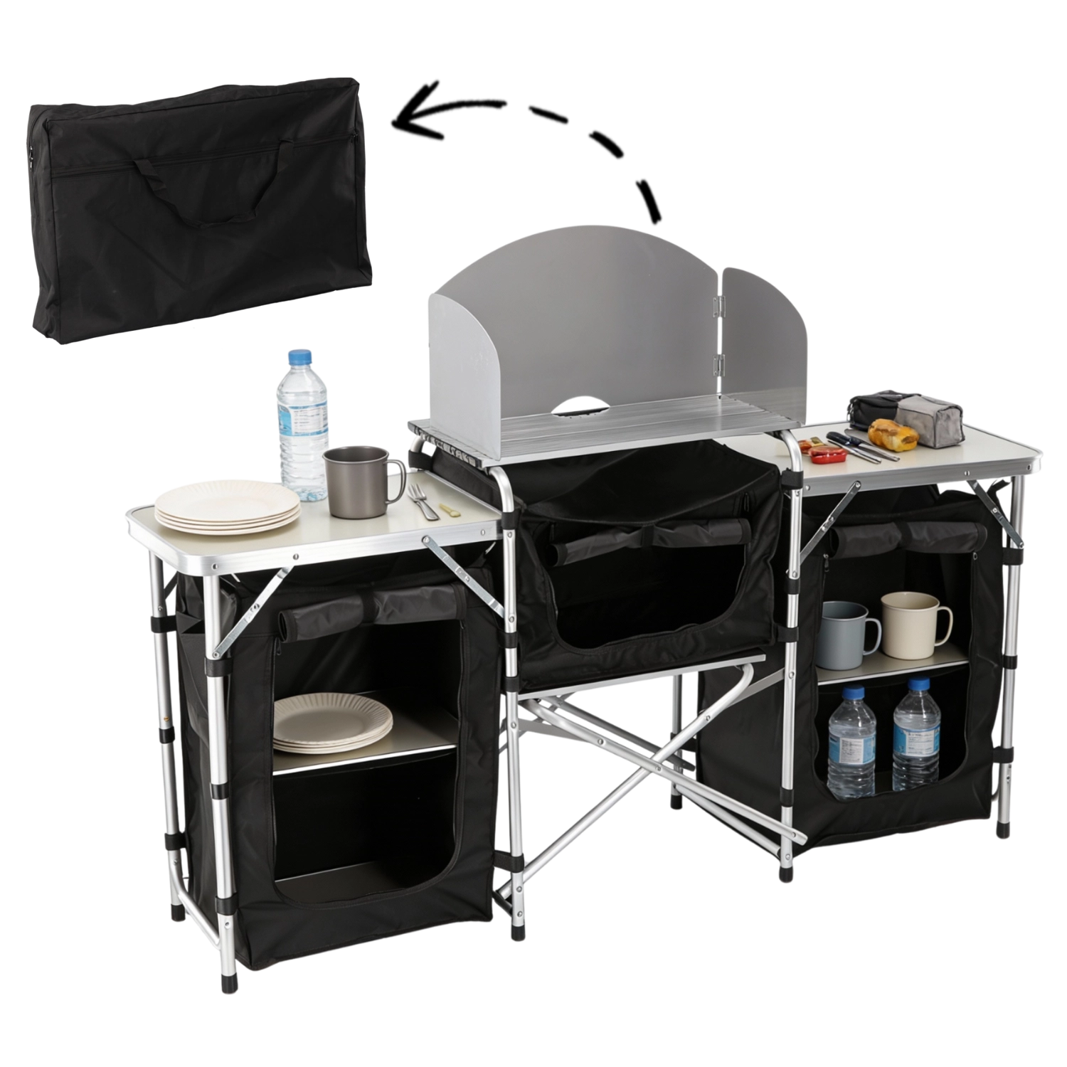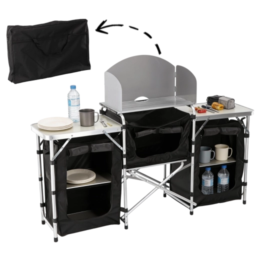 Cuisine de camping pratique et portable pour cuisiner confortablement en pleine nature. Elle offre des plans de travail stables, un cadre en aluminium robuste, un pare-vent intégré et de spacieux placards textiles avec étagères pour un rangement clair de la vaisselle et des aliments. Facile à plier, simple à transporter, elle assure ordre et confort pour cuisiner en voyage.