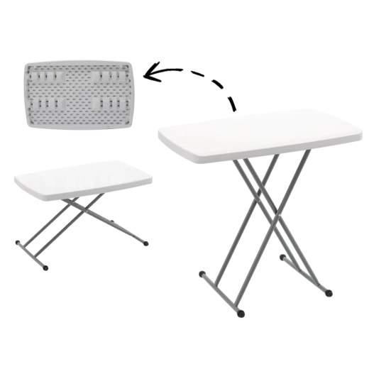 Vous recherchez une table polyvalente qui s’adapte à chaque situation ? Cette table pliante pour le tourisme et le catering, avec des dimensions de 76,5 × 49,5 cm et une plage de hauteur réglable en continu de 36 à 71,5 cm, convient comme table basse, table de service ou table de jardin. Les pieds en acier en croix avec embouts assurent la stabilité sur différentes surfaces, tandis que la structure légère facilite les déplacements fréquents.