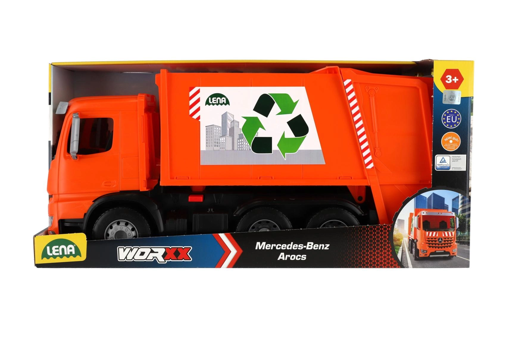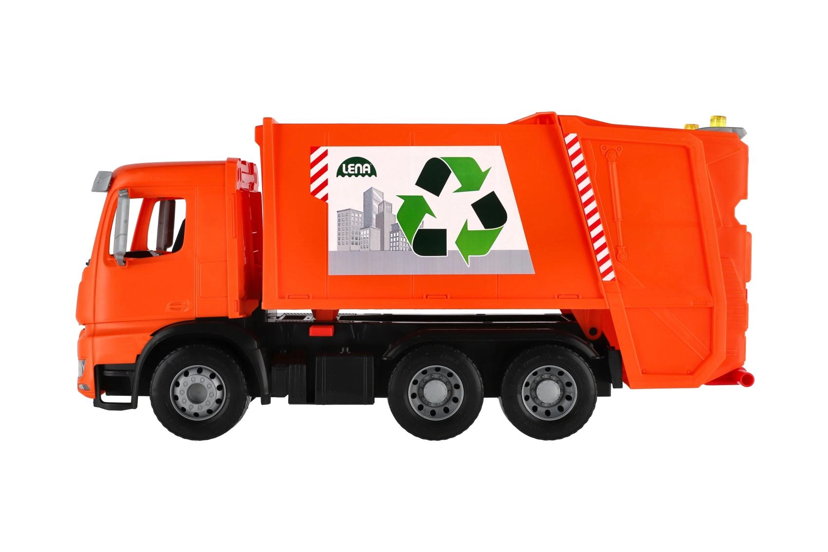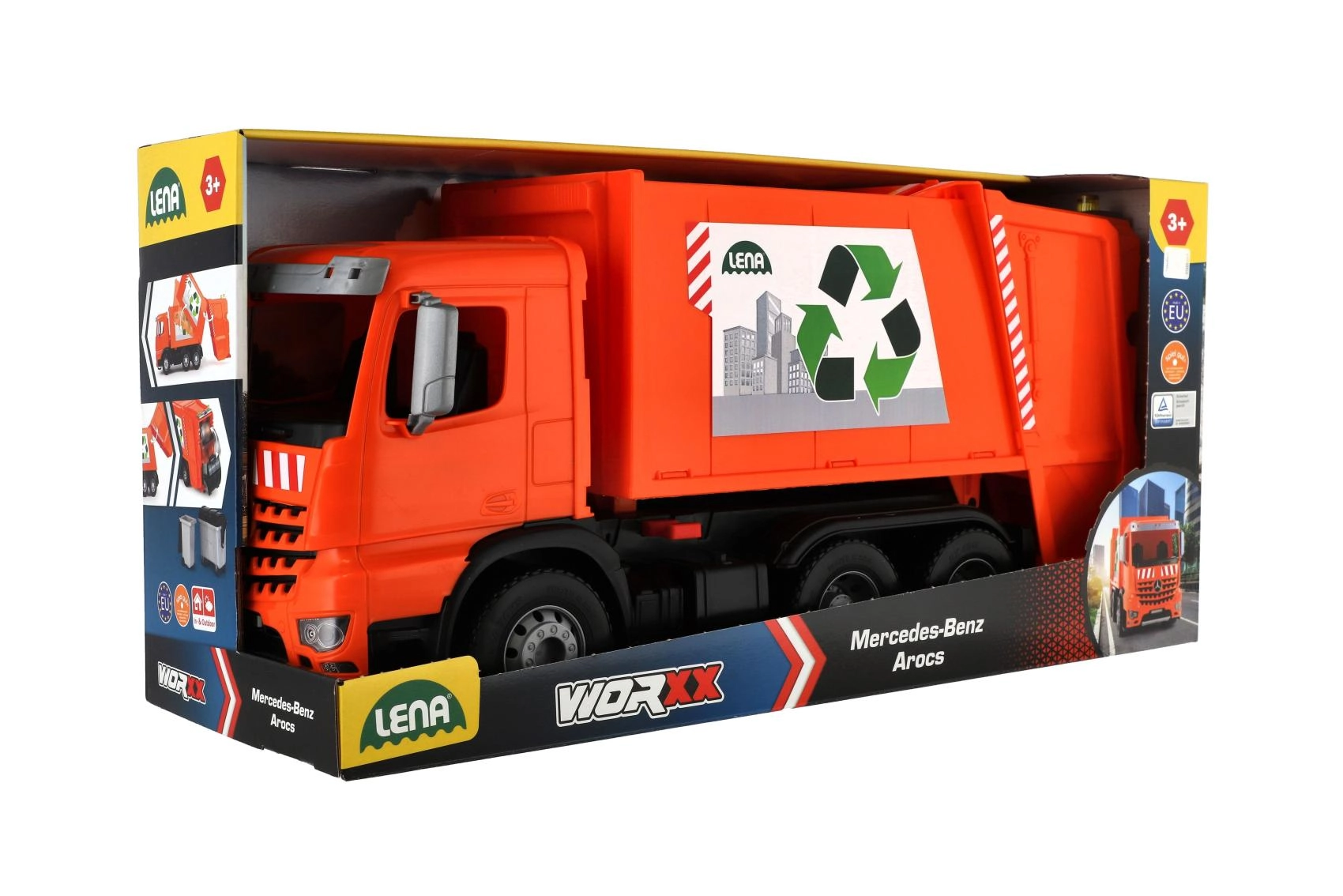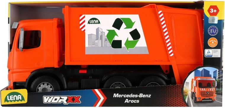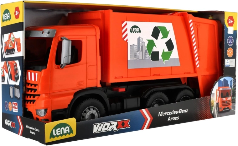 Le camion-benne à ordures MERCEDES AROCS orange de la marque LENA offre aux enfants un jeu réaliste de collecte des déchets. Il propose une structure en plastique résistante, des axes de roues métalliques robustes, un verrou de sécurité contre le basculement involontaire et deux poubelles pour un jeu encore plus amusant. Idéal pour le développement de l’imagination, de la coordination et de la motricité fine à la maison comme au jardin.