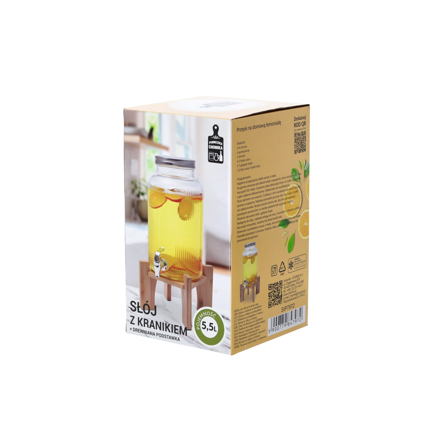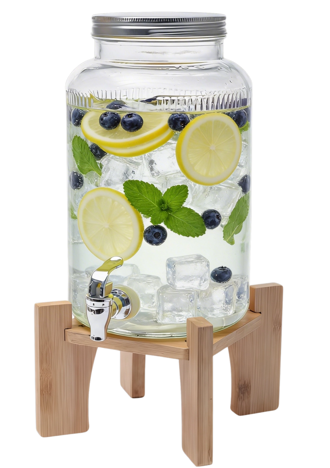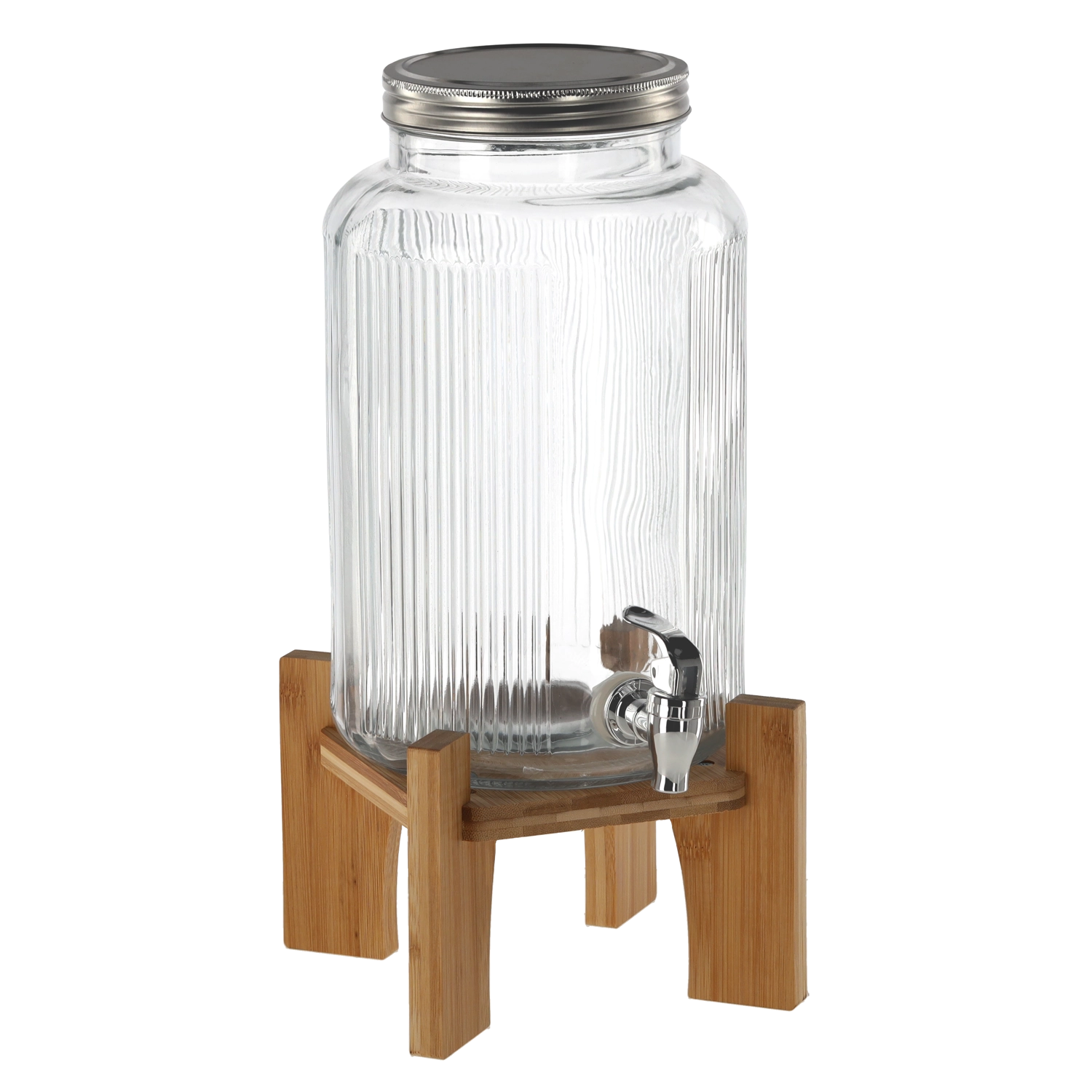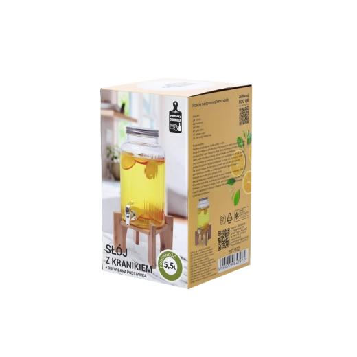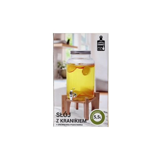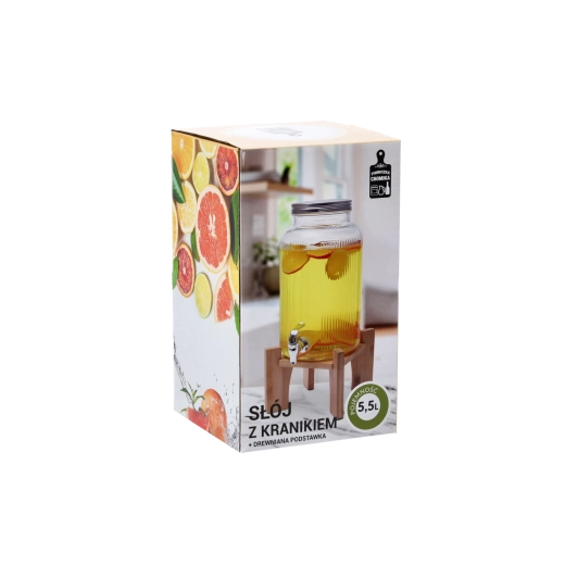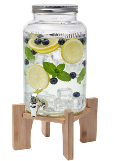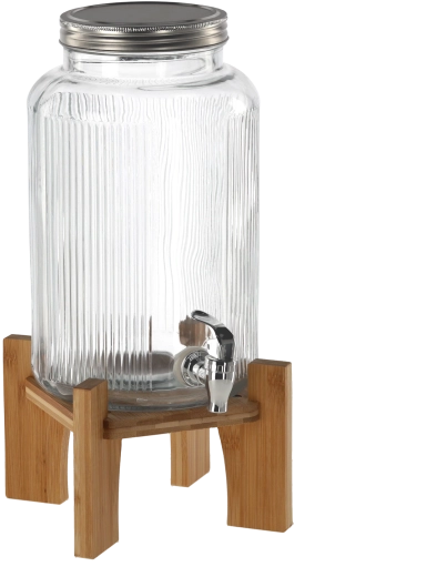 Distributeur de boissons en verre élégant d’une capacité de 5,5 l avec support en bois, idéal pour servir des limonades, des cocktails et des boissons maison lors de garden-parties, pique-niques et fêtes de famille. Grâce à sa large ouverture, vous ajoutez facilement fruits, glace et herbes, et le nettoyage après usage est simple. Le robinet en plastique de couleur argentée permet un service précis sans éclaboussures et le couvercle métallique protège la boisson des impuretés et des insectes.
