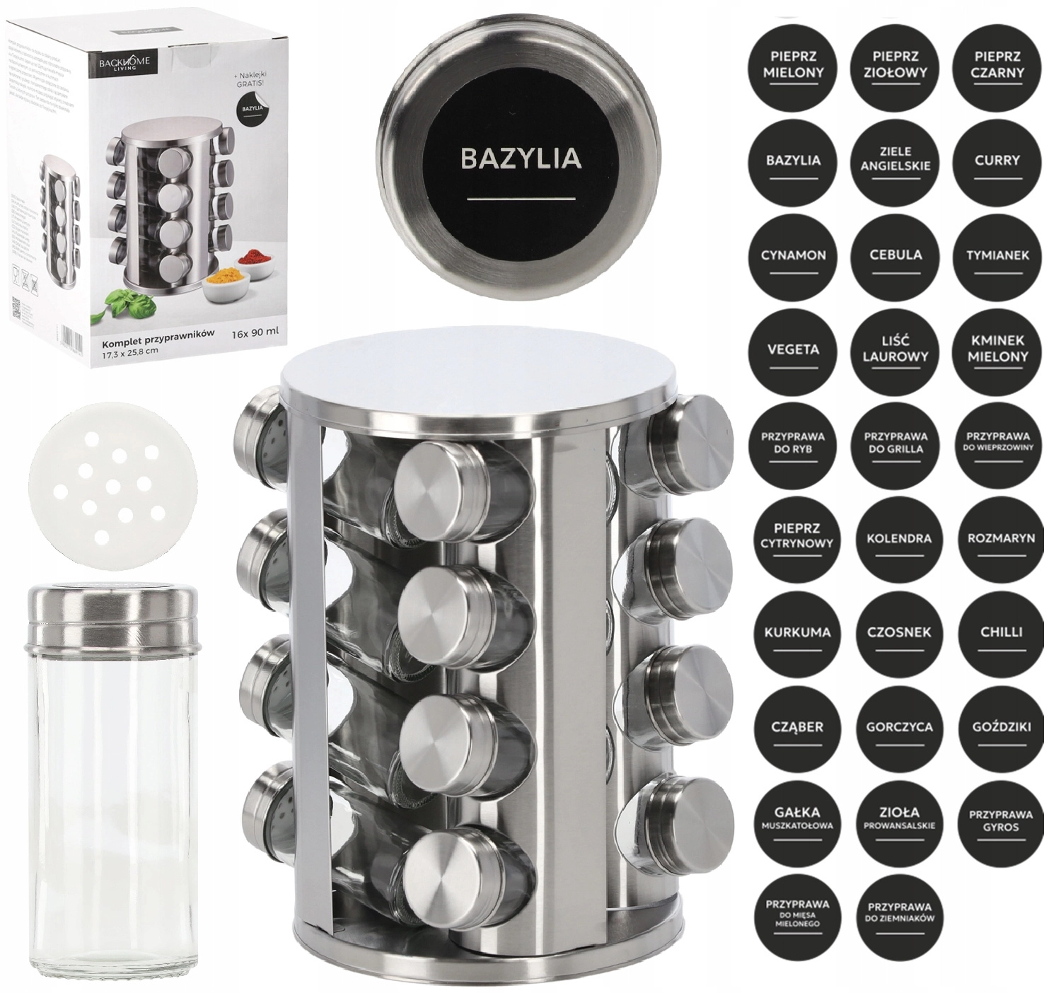 Pratique support à épices pivotant de 17,3 cm de diamètre et 25,8 cm de hauteur, en acier inoxydable résistant, avec 16 pots à épices en verre. Offre un rangement clair des épices, un accès facile grâce à la construction pivotante et une apparence élégante pour toute cuisine. Comprend un lot de 38 étiquettes autocollantes pour un marquage rapide des pots.