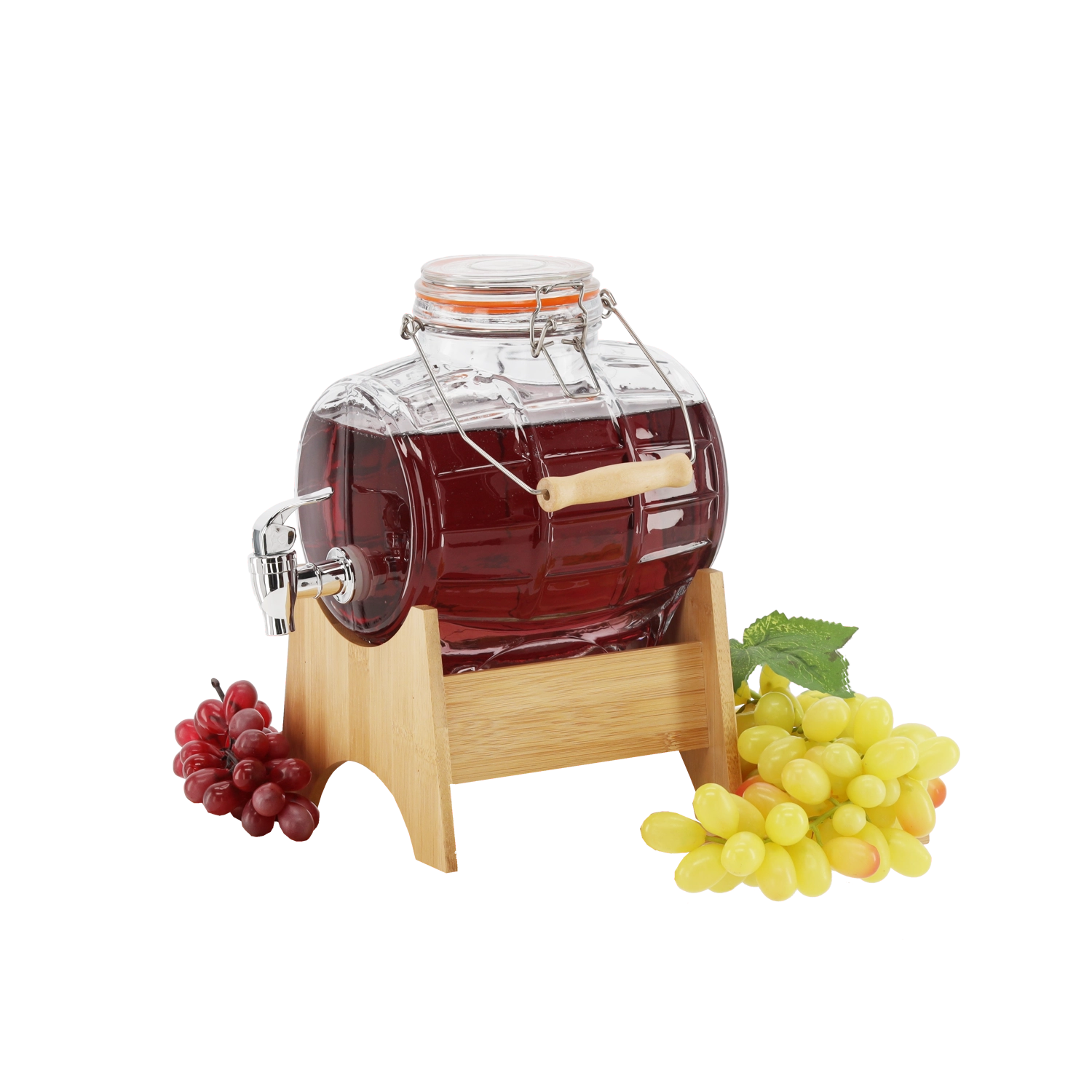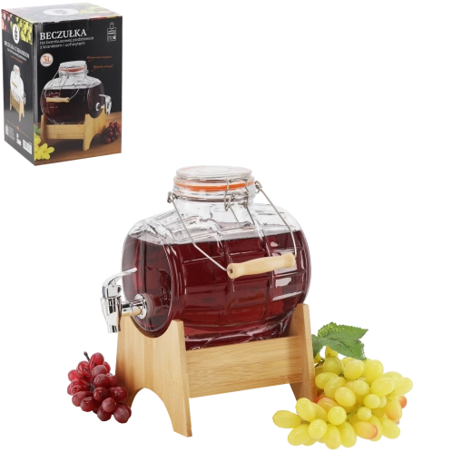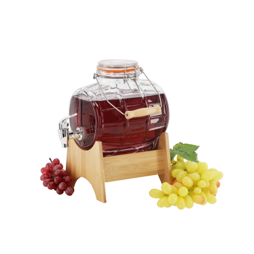 Élégante bonbonne en verre de 3 litres, idéale pour servir vin, bière, jus et limonades. Elle offre un verre épais et résistant, un robinet en plastique pratique pour un service fluide, ainsi qu’une fermeture mécanique avec joint en caoutchouc pour une étanchéité parfaite. Livrée avec un support en bambou élégant assurant stabilité et confort d’utilisation à la maison, lors de fêtes et de mariages.