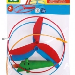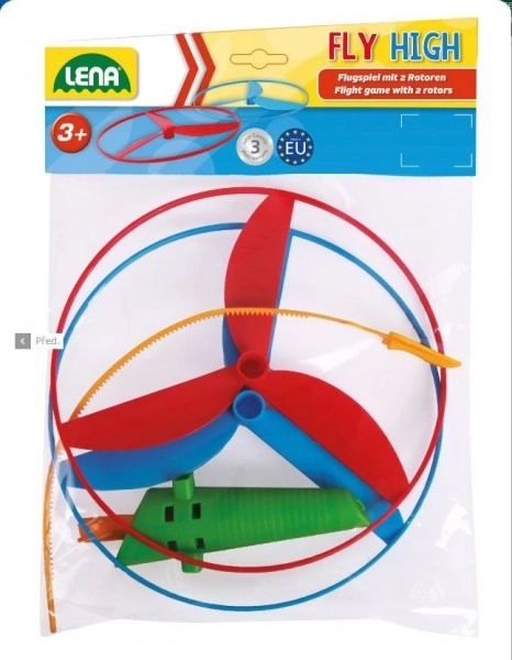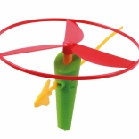 Le pack comprend deux hélices qui peuvent être facilement lancées à l'aide d'un mécanisme sur la poignée verte. Les couleurs rouge et bleu vives des rotors ajoutent une attraction visuelle supplémentaire au jouet et stimulent l'imagination des enfants.