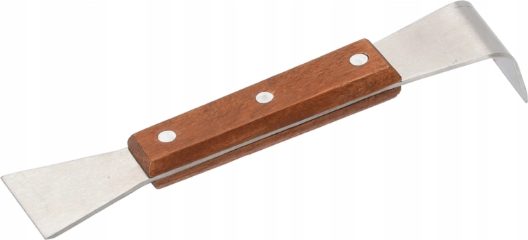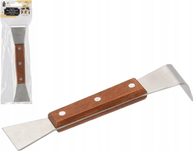 Ciseau apicole universel en acier inoxydable avec manche ergonomique en bois et crochet pour extraire facilement les cadres. Résistant, pratique et idéal pour gratter la propolis, faire levier sur les cadres et l’entretien quotidien de la ruche.