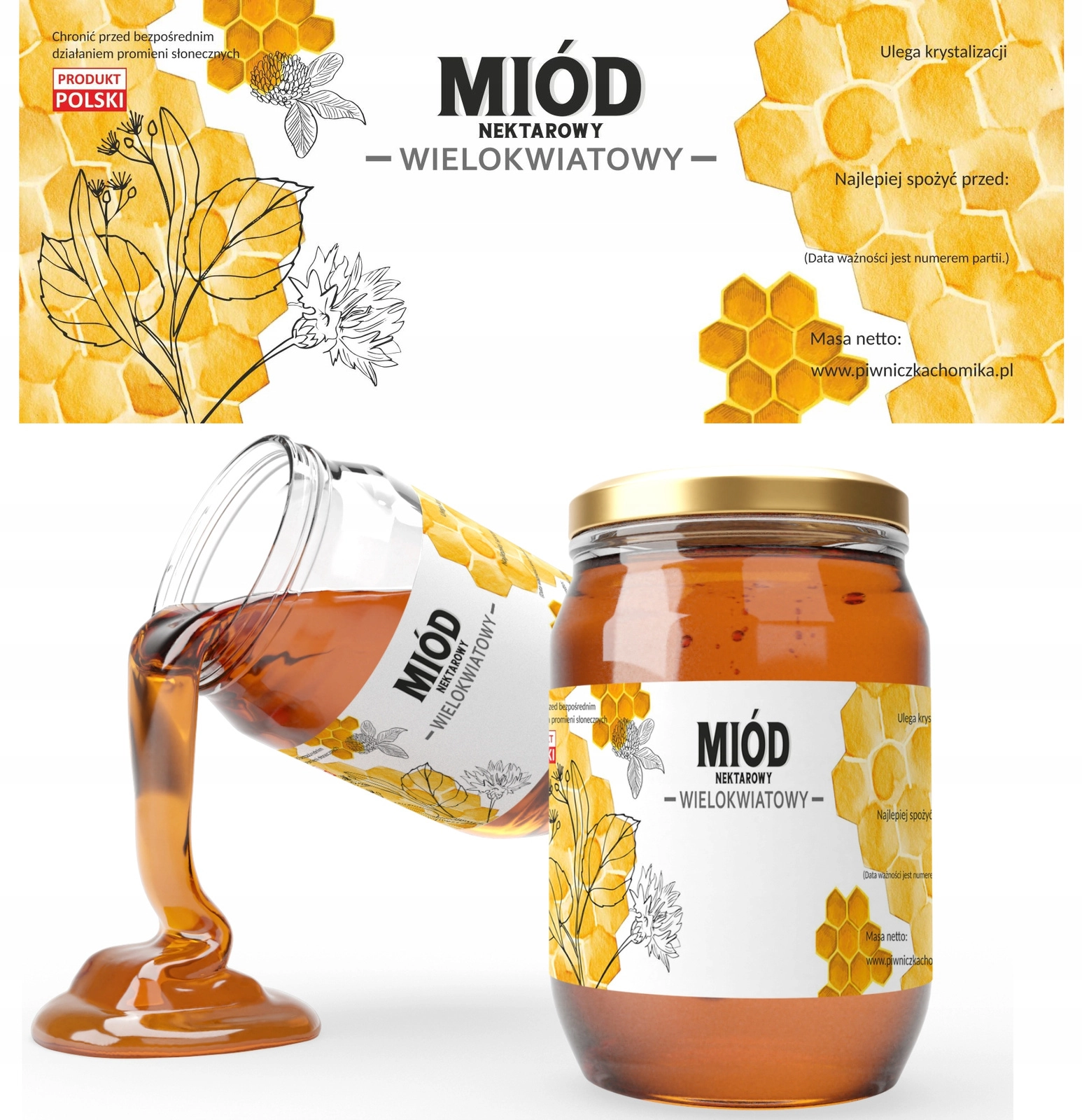 - Marquage clair – espace pour le nom du miel et la date de durabilité minimale.