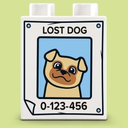 Le set comprend une affiche d'avis de recherche pour le chien perdu et une moto qui incite les enfants à créer des histoires.