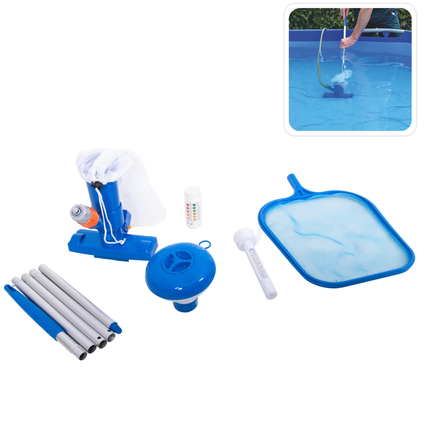 Kit complet pour l’entretien de la piscine, qui facilite les soins quotidiens de l’eau et des parois. Comprend un doseur flottant de produits chimiques, un thermomètre, des bandelettes de test 3 en 1, un aspirateur de piscine, une épuisette et une perche télescopique de 122 cm. Idéal pour enlever rapidement les feuilles, nettoyer le fond et contrôler régulièrement la qualité de l’eau.