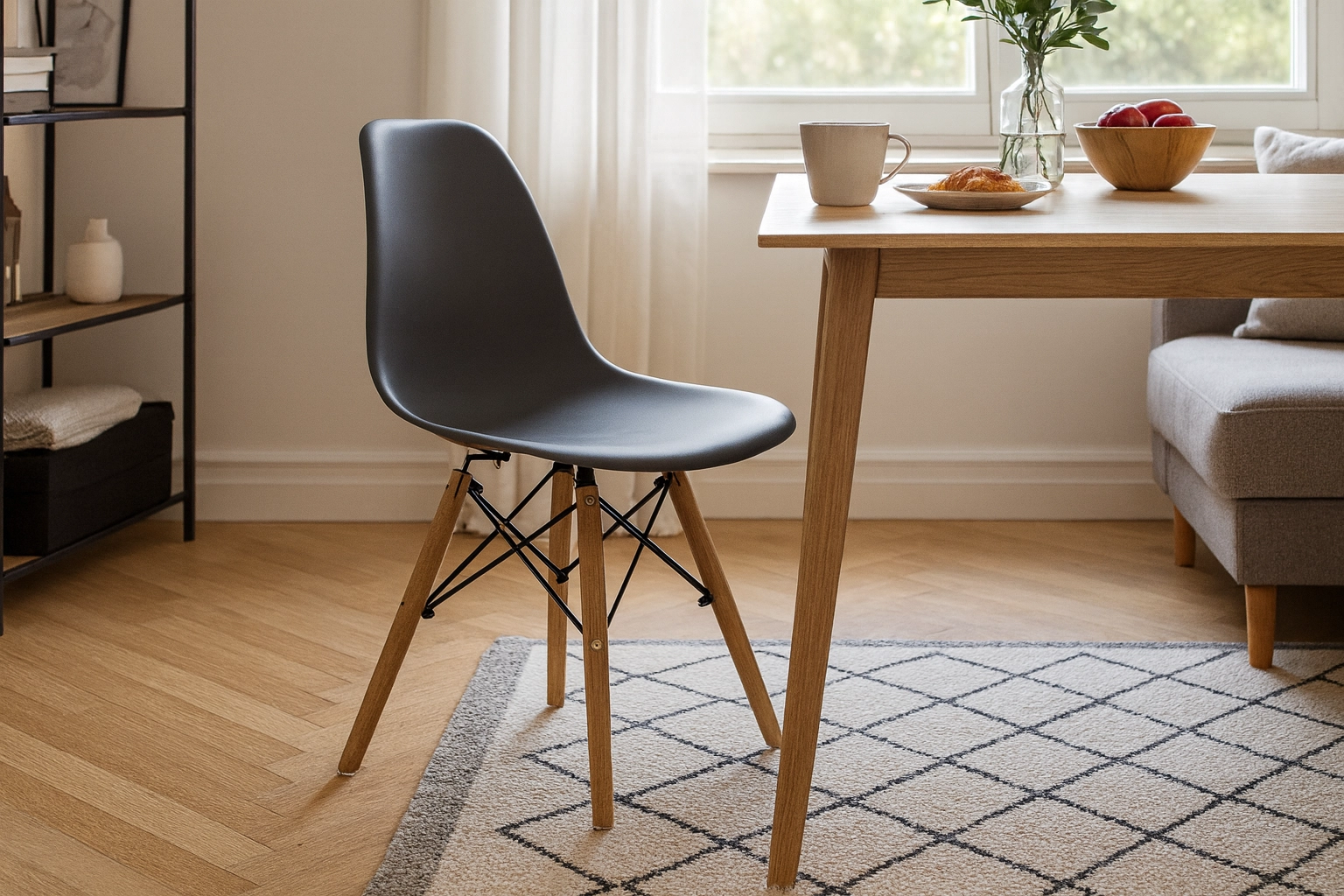 Cette chaise grise élégante avec assise plastique moulée apporte un confort au quotidien et un style intemporel à tout intérieur, du scandinave au loft moderne. Les pieds en hêtre au ton chaleureux et les renforts métalliques noirs offrent stabilité et contraste visuel.