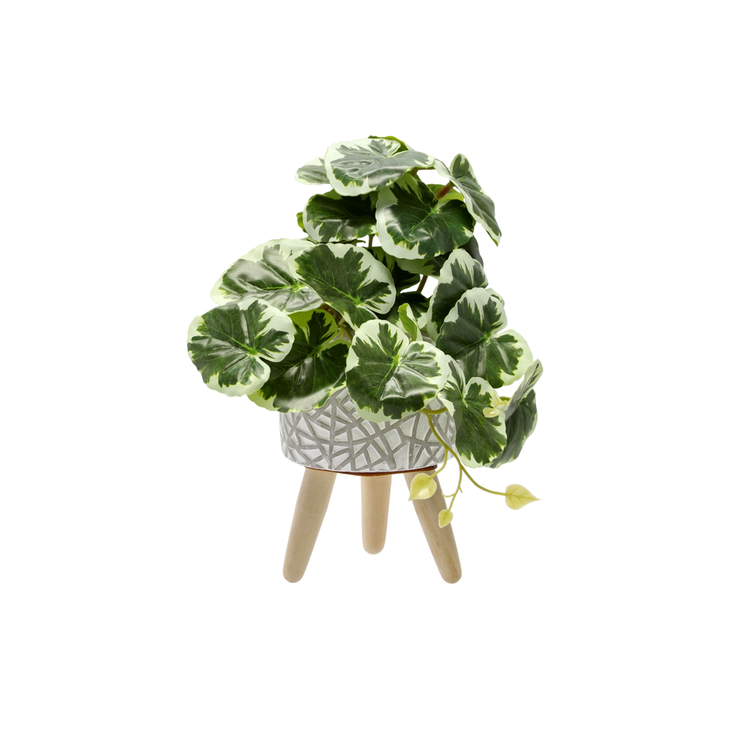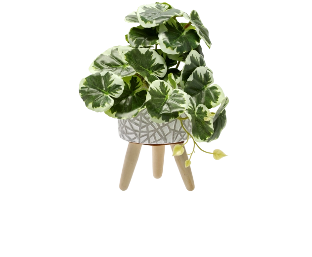 Décoration stylée et minimaliste pour les intérieurs modernes. Plante artificielle de 20 cm de hauteur avec des feuilles bicolores réalistes et un pot élégant sur pieds en bois qui apporte une touche de fraîcheur à la maison comme au bureau, sans souci d’entretien.