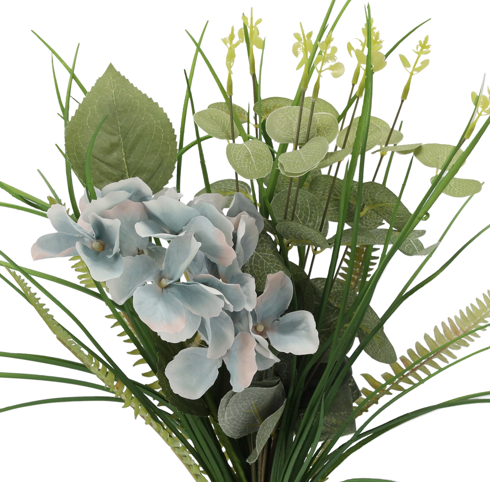 Des feuilles finement façonnées et de délicates fleurs bleues paraissent naturelles, mais ne nécessitent ni arrosage ni soins particuliers.