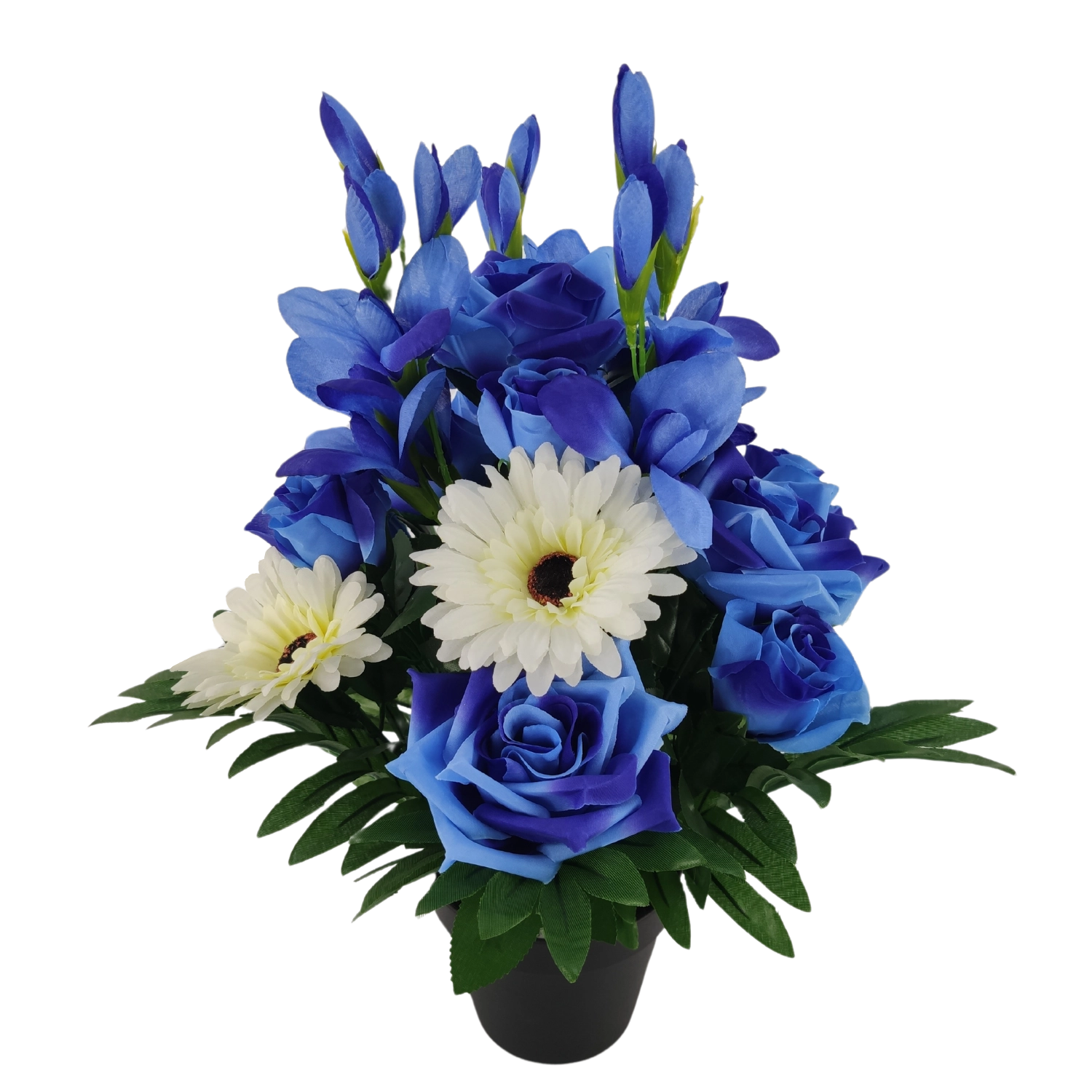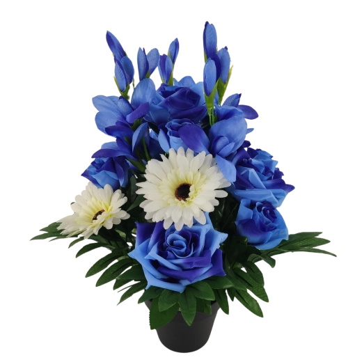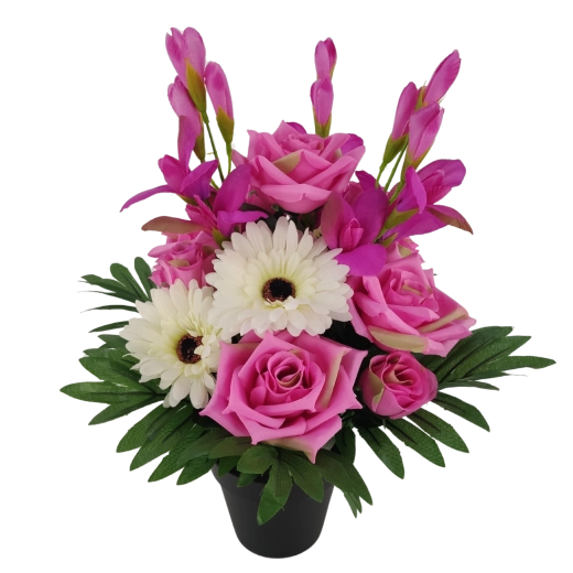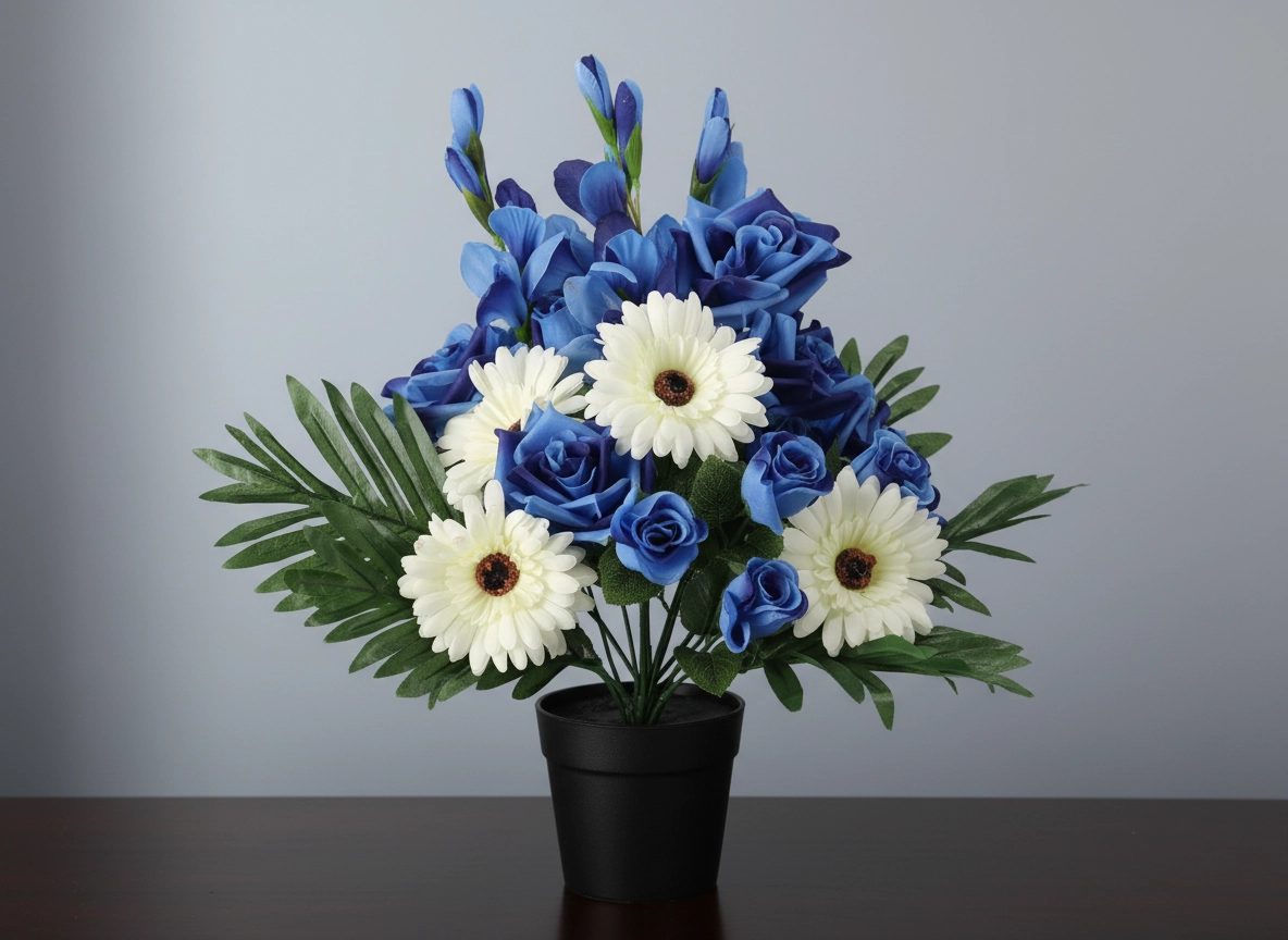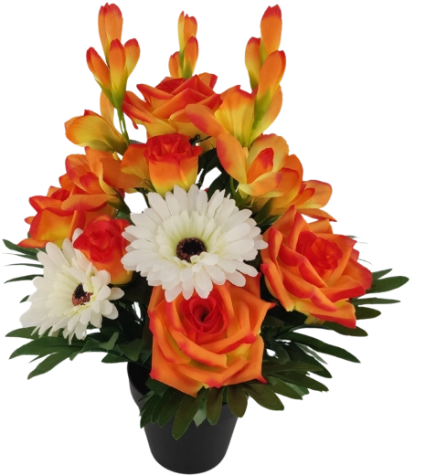 Cette composition florale prête à l’emploi séduit par son aspect réaliste, ses couleurs soutenues et l’agencement soigné des fleurs. Grâce à son format compact, elle convient parfaitement au salon, au bureau, à un établissement ou comme décoration digne d’un lieu de mémoire.