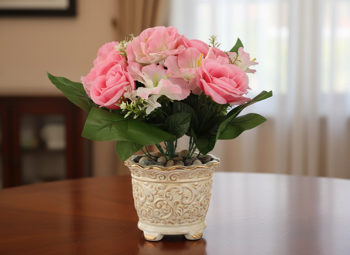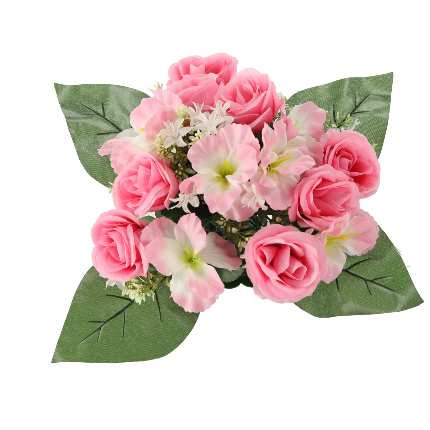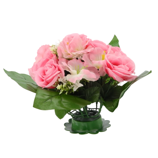 Élégant bouquet artificiel associant roses et hibiscus avec un feuillage abondant dans une composition harmonieuse. Grâce à ses dimensions 25 × 28 × 28 cm et à son mélange de couleurs, il convient à tout intérieur ainsi qu’aux tables de fête. Il offre des détails réalistes, une longue durée de vie et aucun entretien – toujours magnifique sans arrosage.