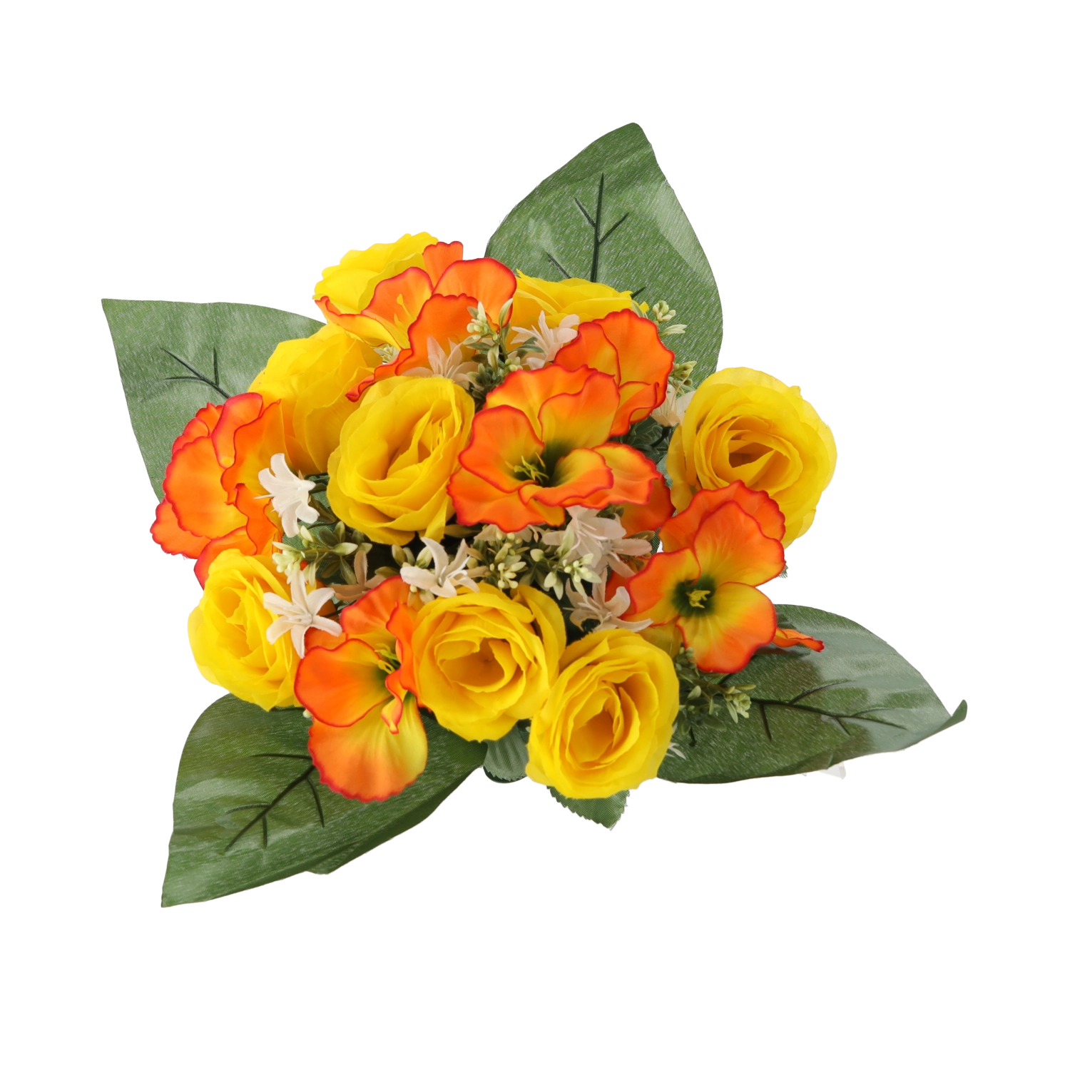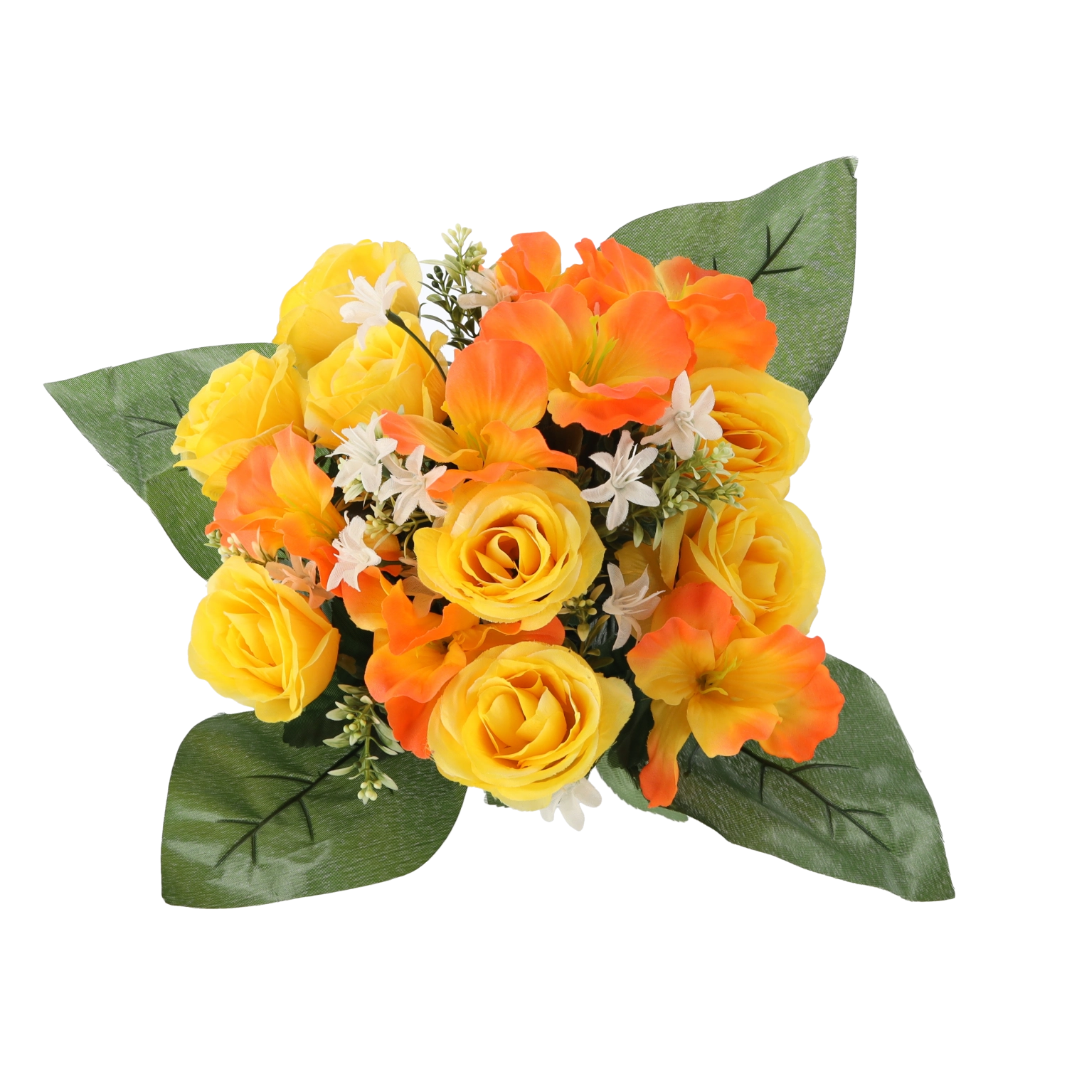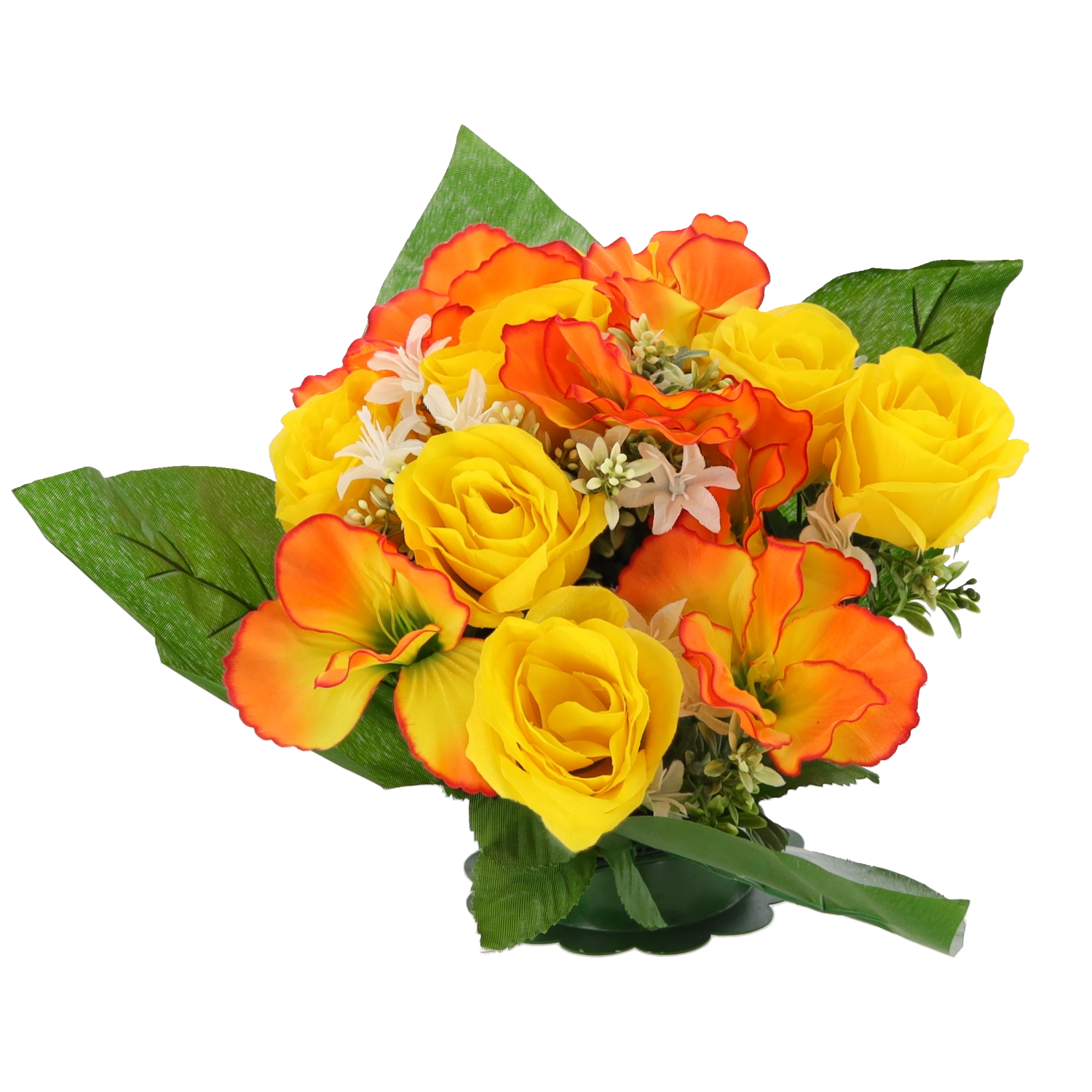 Bouquet artificiel (roses et hibiscus) avec feuillage décoratif