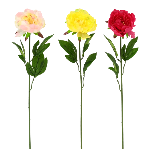 Une pivoine artificielle de 65 cm élégante et réaliste qui illumine tout intérieur. Grâce à ses fleurs pleines fidèles et à ses feuilles au rendu naturel, elle paraît vivante, ne requiert aucun entretien et est résistante et durable. Disponible en mélange de couleurs (rose, jaune, rouge) pour s’accorder facilement à vos décorations.