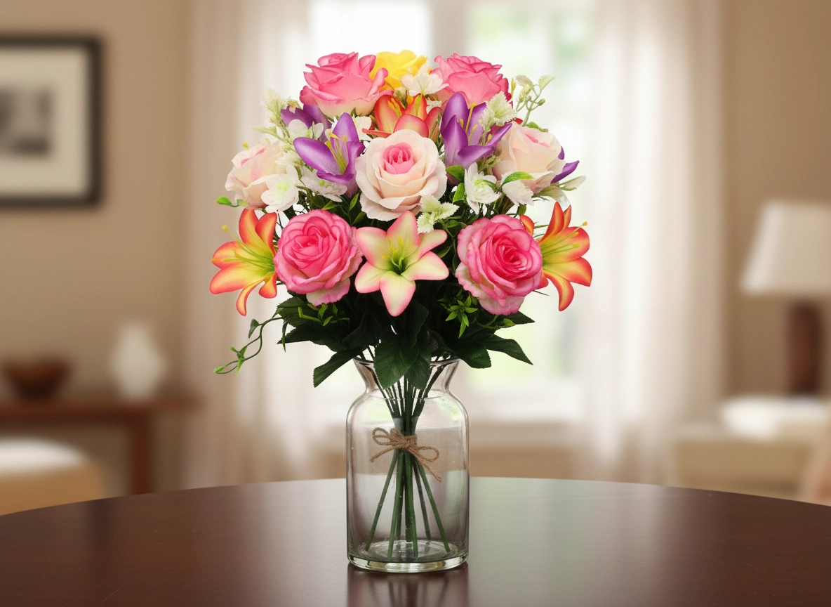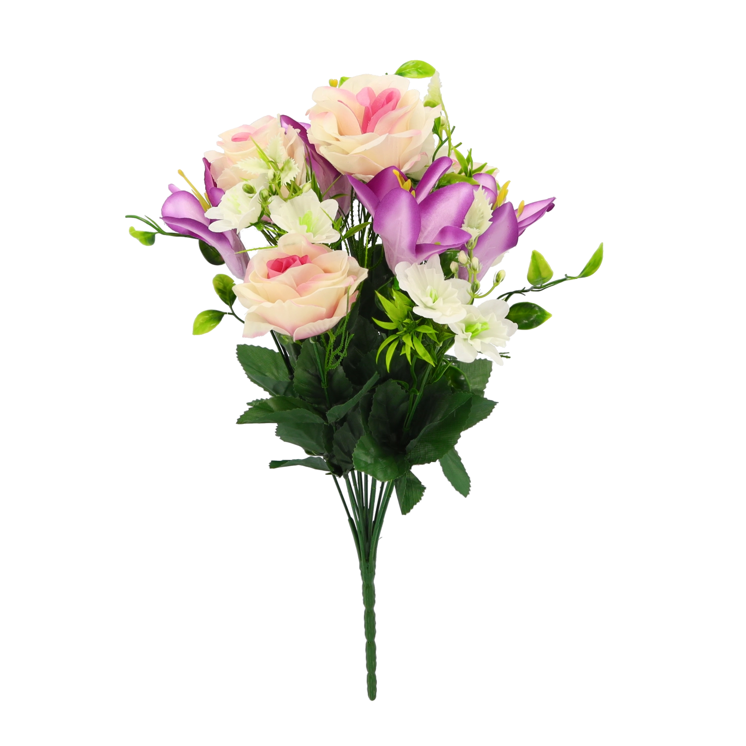 Bouquet artificiel élégant combinant roses classiques et lys raffinés avec une verdure généreuse. Grâce à ses dimensions de 43 × 25 × 25 cm et à son mélange de couleurs, il paraît naturel et frais toute l’année. Détails réalistes, matériaux durables et zéro entretien en font une décoration parfaite pour le salon, la chambre, le bureau ou l’accueil.