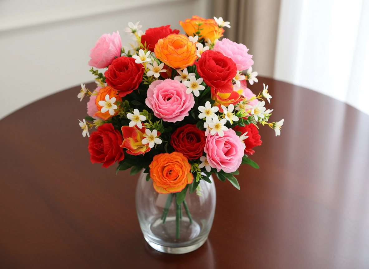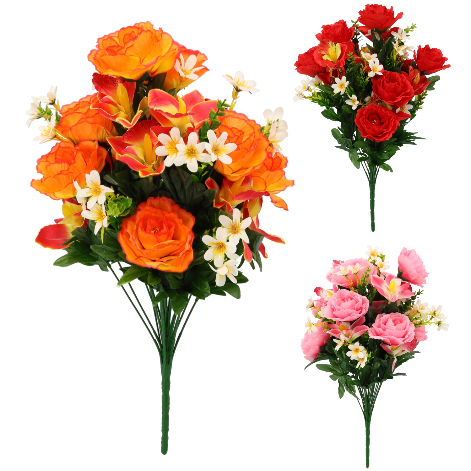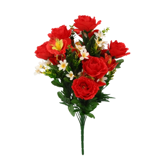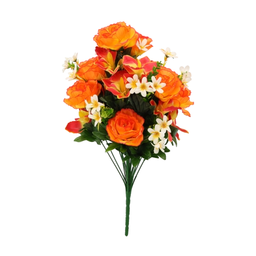 Élégant bouquet artificiel associant des roses, des orchidées et de petites fleurs blanches en assortiment de couleurs (rouge, rose, orange). Il offre des détails réalistes, une longue durabilité sans entretien et illumine instantanément tout intérieur comme toute décoration festive.