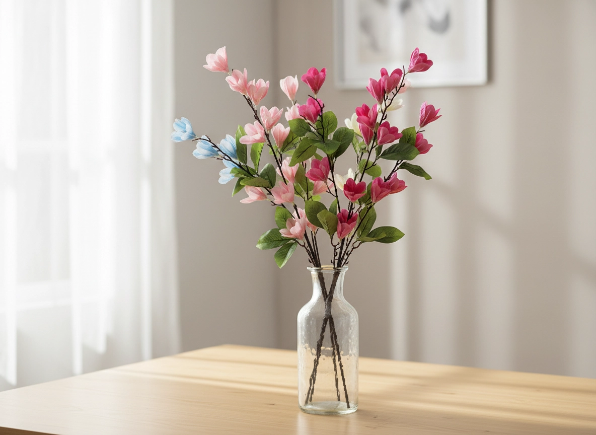 Le mélange de couleurs (nuances de rose, blanc et bleu clair) permet d’harmoniser facilement la décoration avec un style d’intérieur moderne ou romantique. La tige flexible peut être façonnée selon les besoins pour créer des compositions naturelles, sans chute de feuilles et sans arrosage.