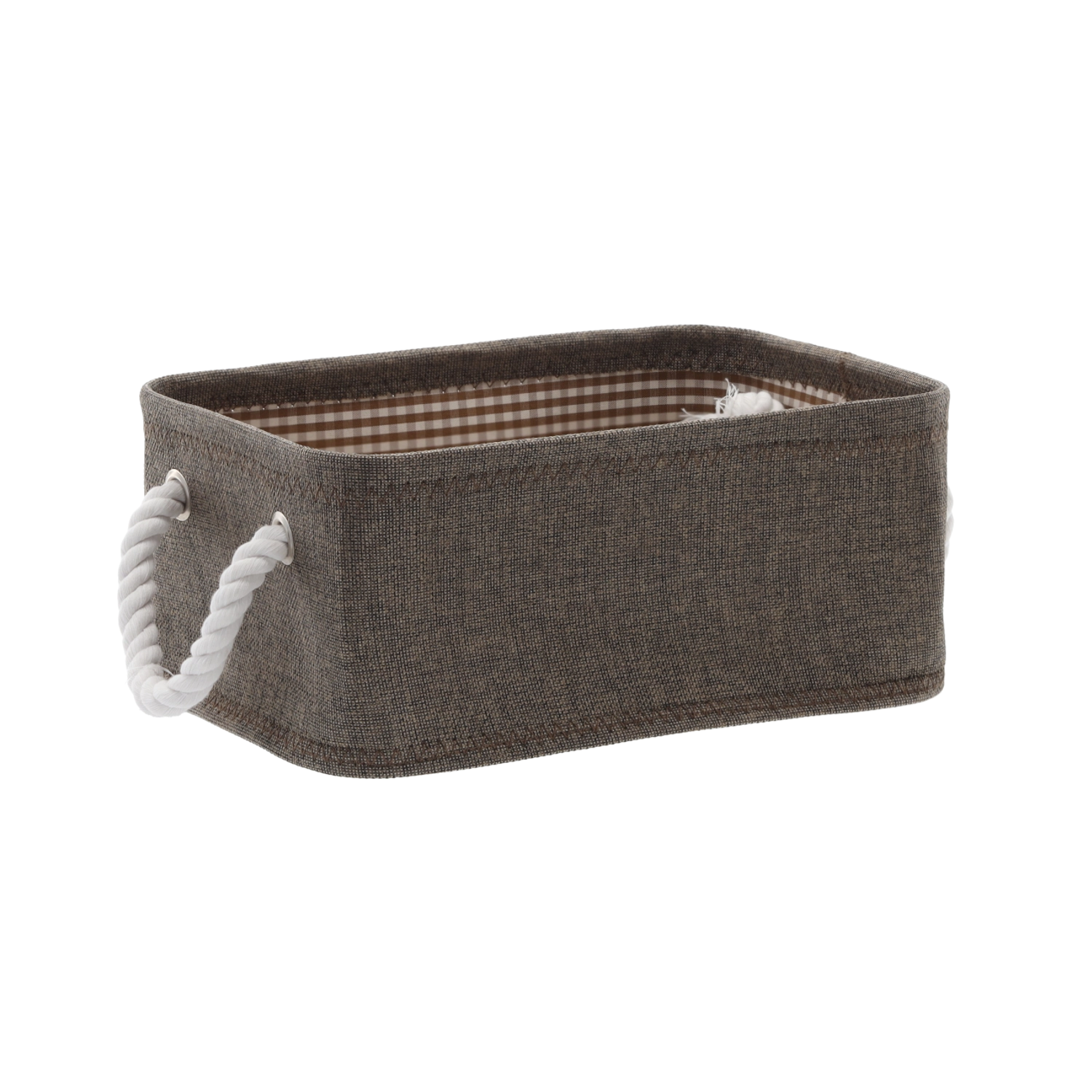 Le textile brun neutre et la doublure délicatement à carreaux complètent un intérieur moderne et aident à maintenir l’ordre sur les étagères et les commodes.