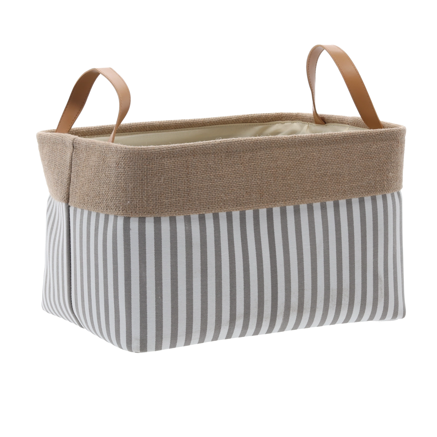 Panier de rangement élégant de forme rectangulaire offrant ample espace pour les vêtements, les jouets et les accessoires ménagers. Grâce à son design rayé, il s’intègre parfaitement aux intérieurs modernes, est pliable pour gagner de la place et possède de pratiques poignées latérales pour un transport facile.