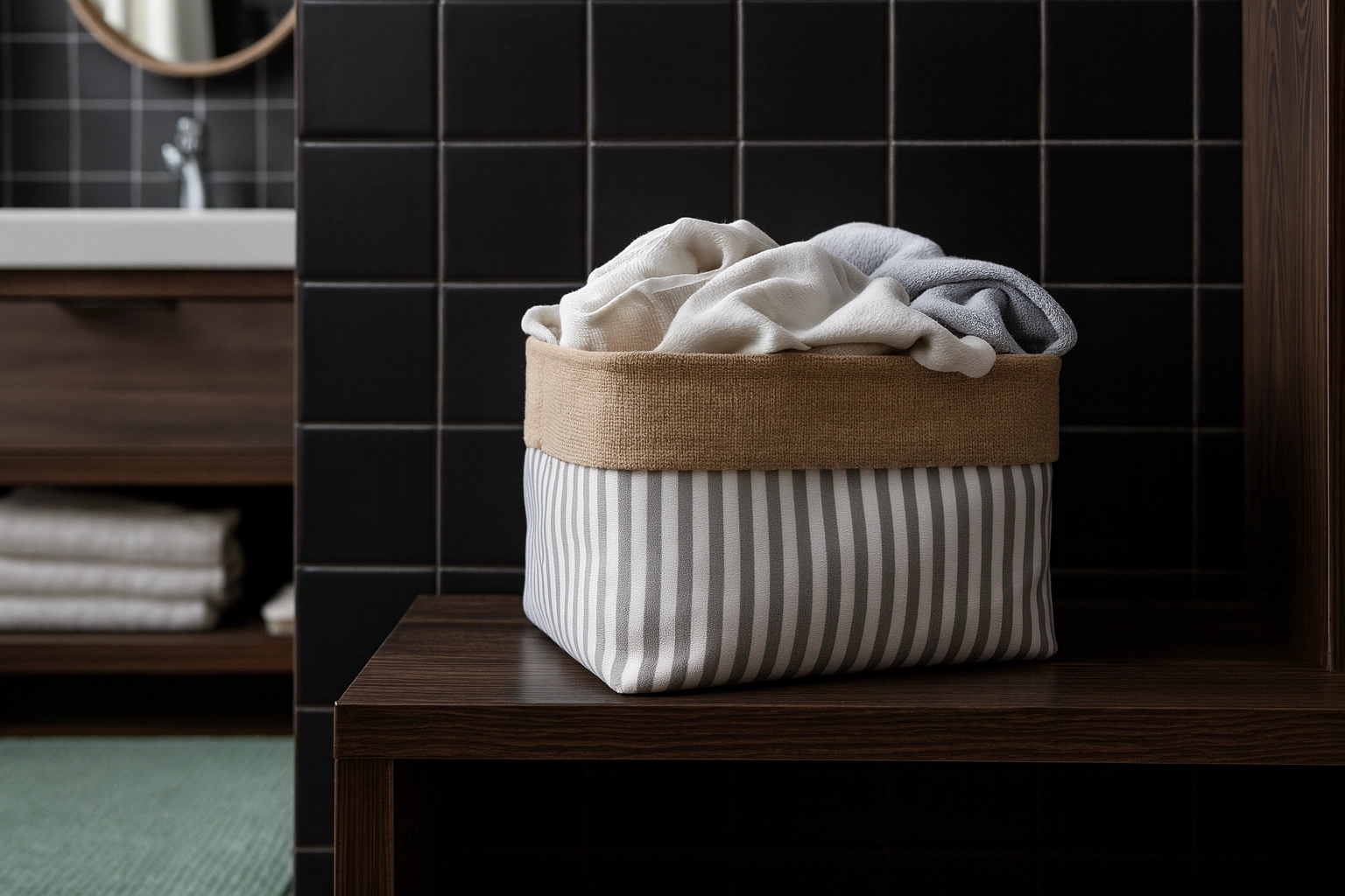 Le motif rayé intemporel et les lignes épurées font de ce panier un élément à la fois pratique et décoratif pour le salon, la chambre et la salle de bain.