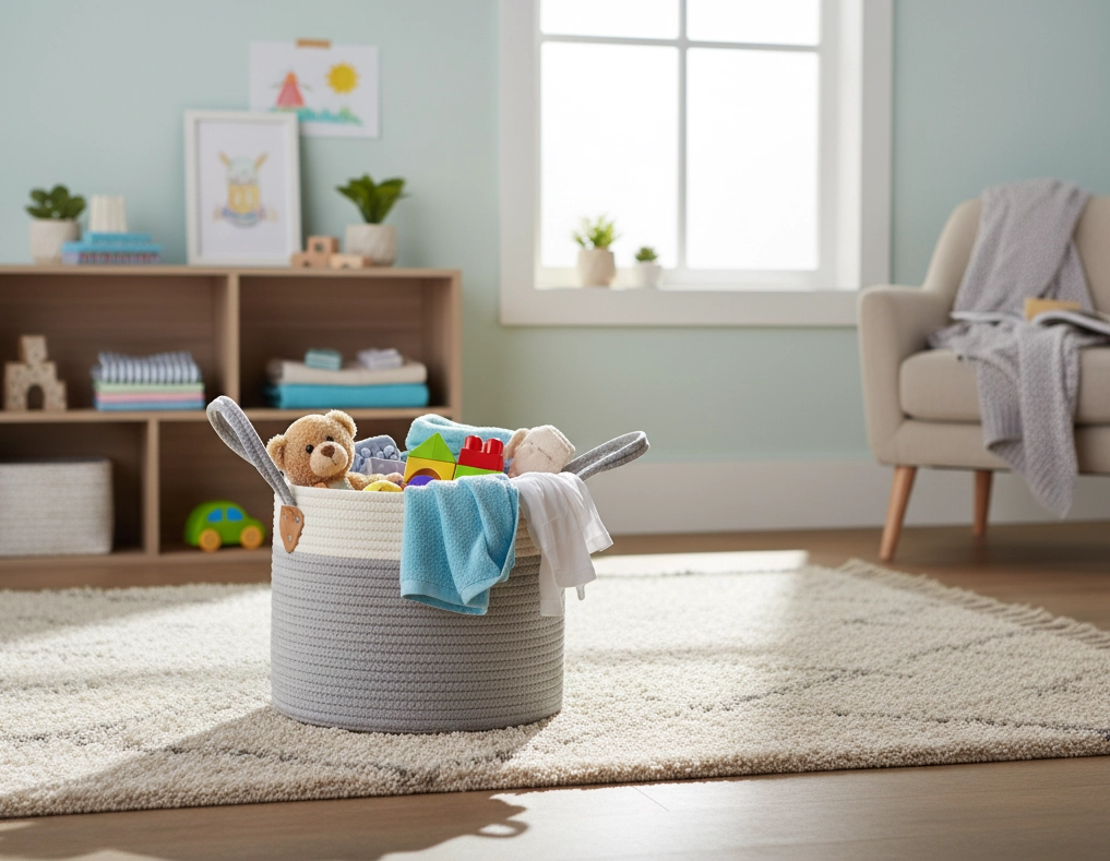 Les poignées latérales intégrées facilitent la manipulation – vous déplacez aisément le panier entre la salle de bain, la chambre et la chambre d’enfant.