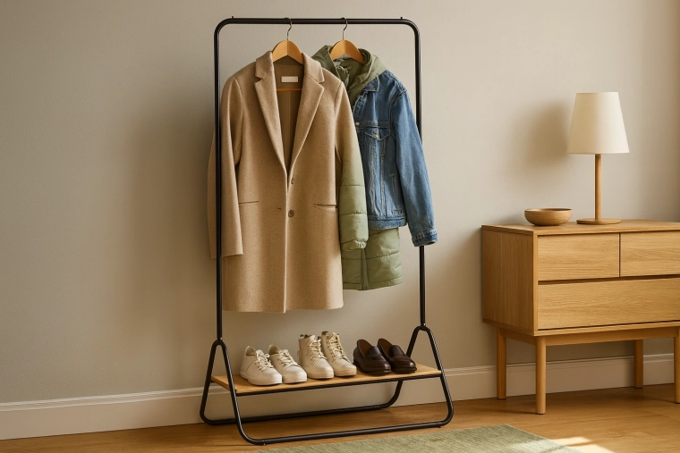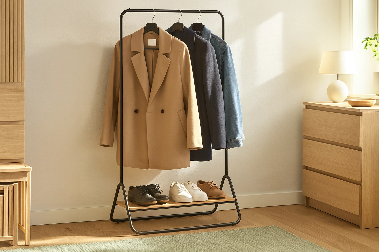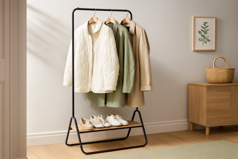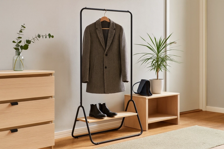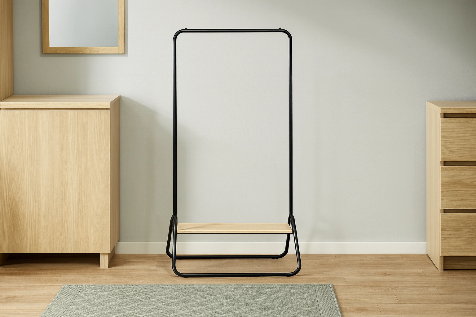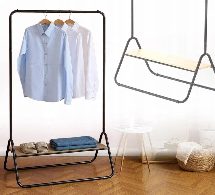 L’étagère inférieure en MDF de 12 mm d’épaisseur est idéale pour les chaussures, sacs et paniers de rangement, tandis que la tringle supérieure accueille les tenues du quotidien comme les manteaux plus volumineux. Le revêtement par poudre améliore la résistance aux rayures et à la corrosion, garantissant une utilisation durable.
