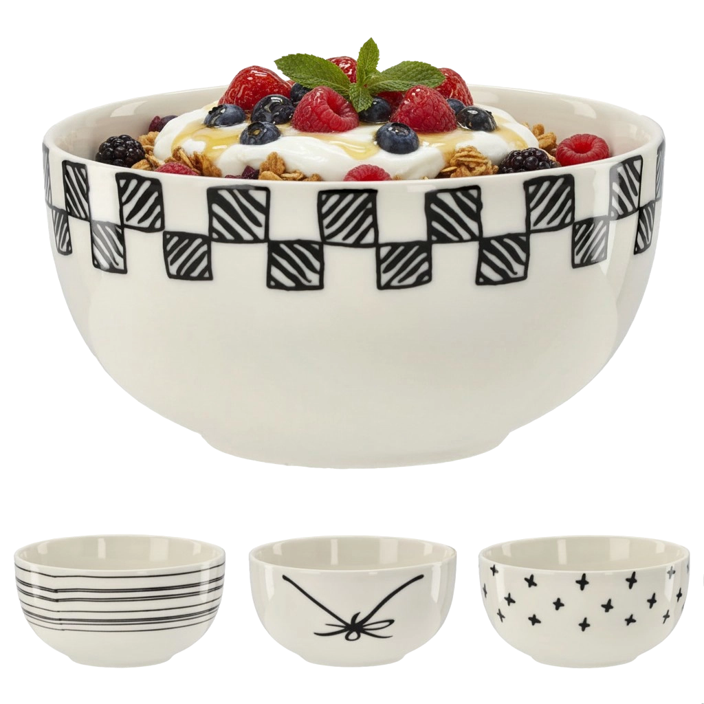 Offrez-vous un service parfait avec le bol Black & White de 550 ml. Grâce à sa céramique de qualité et à sa glaçure brillante, il convient aux céréales du petit-déjeuner, aux soupes, aux salades et aux en-cas. Les motifs minimalistes noir et blanc subliment toute table et se marient facilement avec d’autres pièces de vaisselle.