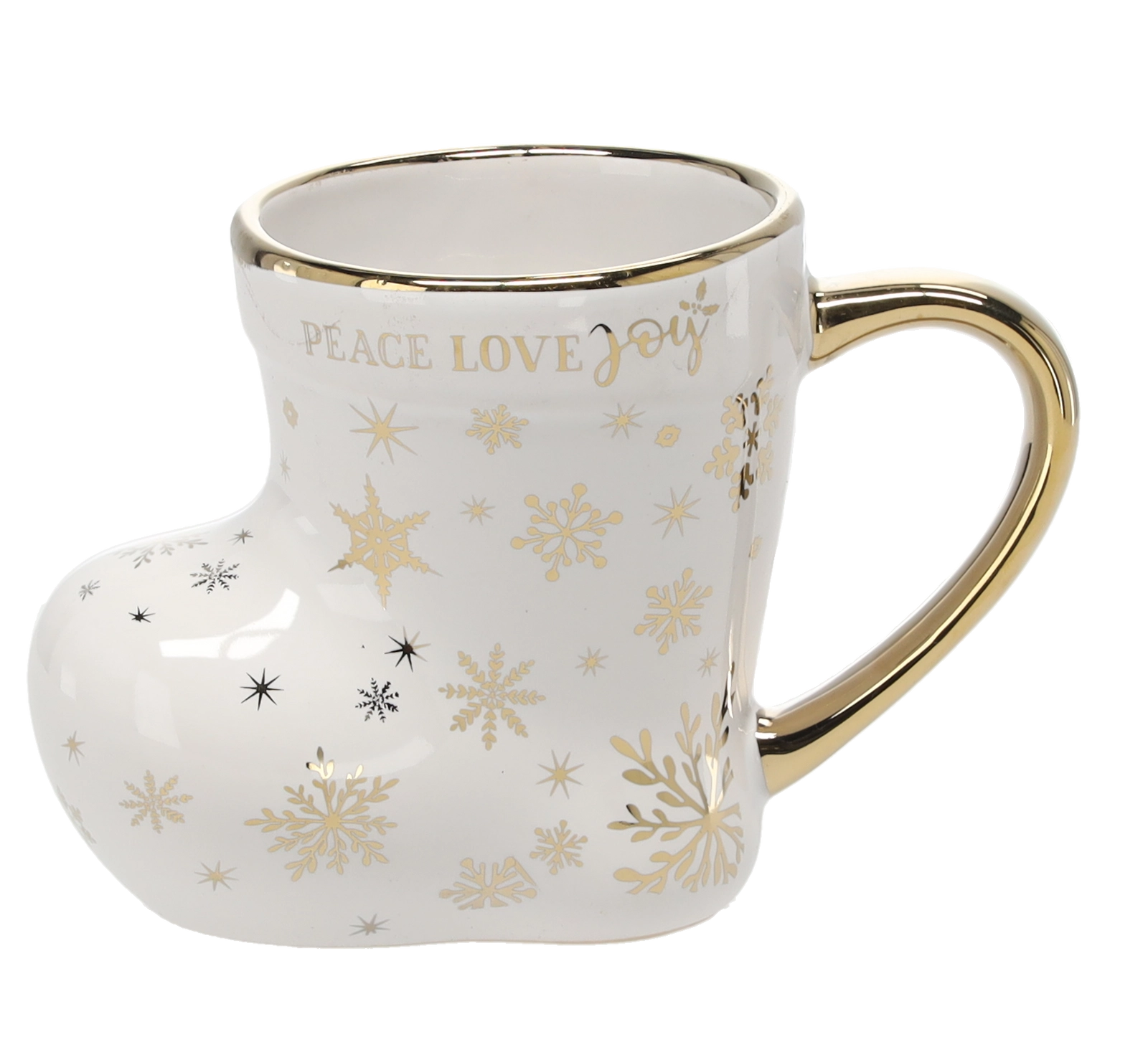 Ce mug enchanteur en forme de petite botte de Noël allie design original et sens pratique. Fabriqué en porcelaine de qualité, il est durable, agréable au toucher et conserve parfaitement la chaleur. Les motifs dorés et l’anse dorée lui donnent une allure unique qui s’intègre à tout intérieur à l’ambiance festive.