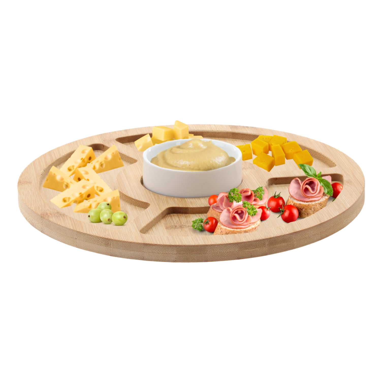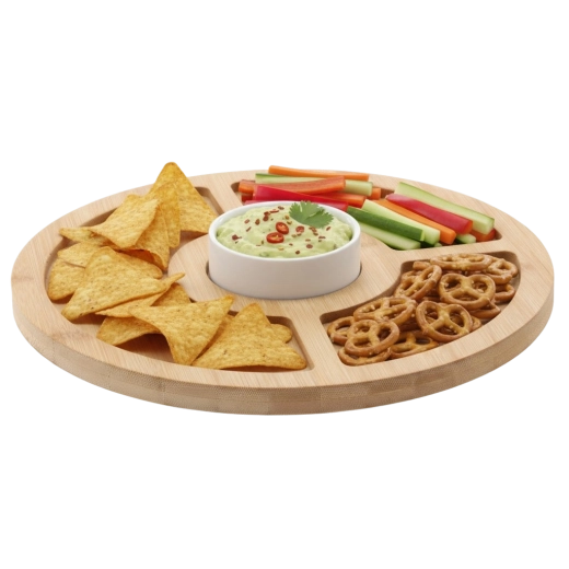 Ce plateau rond de service en bambou avec bol en porcelaine est une excellente solution pour les réceptions à la maison comme pour les événements conviviaux. Grâce à ses quatre sections séparées, chaque type d’en-cas reste à sa place, tandis que le bol central en porcelaine est idéal pour les dips et les sauces.
