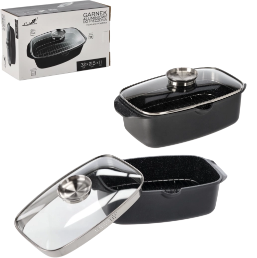 Découvrez une rôtissoire en aluminium pratique avec couvercle en verre, qui deviendra un auxiliaire indispensable dans votre cuisine. Grâce à l’aluminium de qualité, la chaleur se propage rapidement et uniformément, garantissant des plats juteux et parfaitement cuits. Le couvercle en verre transparent permet de contrôler la cuisson sans perte inutile de chaleur ni d’humidité.