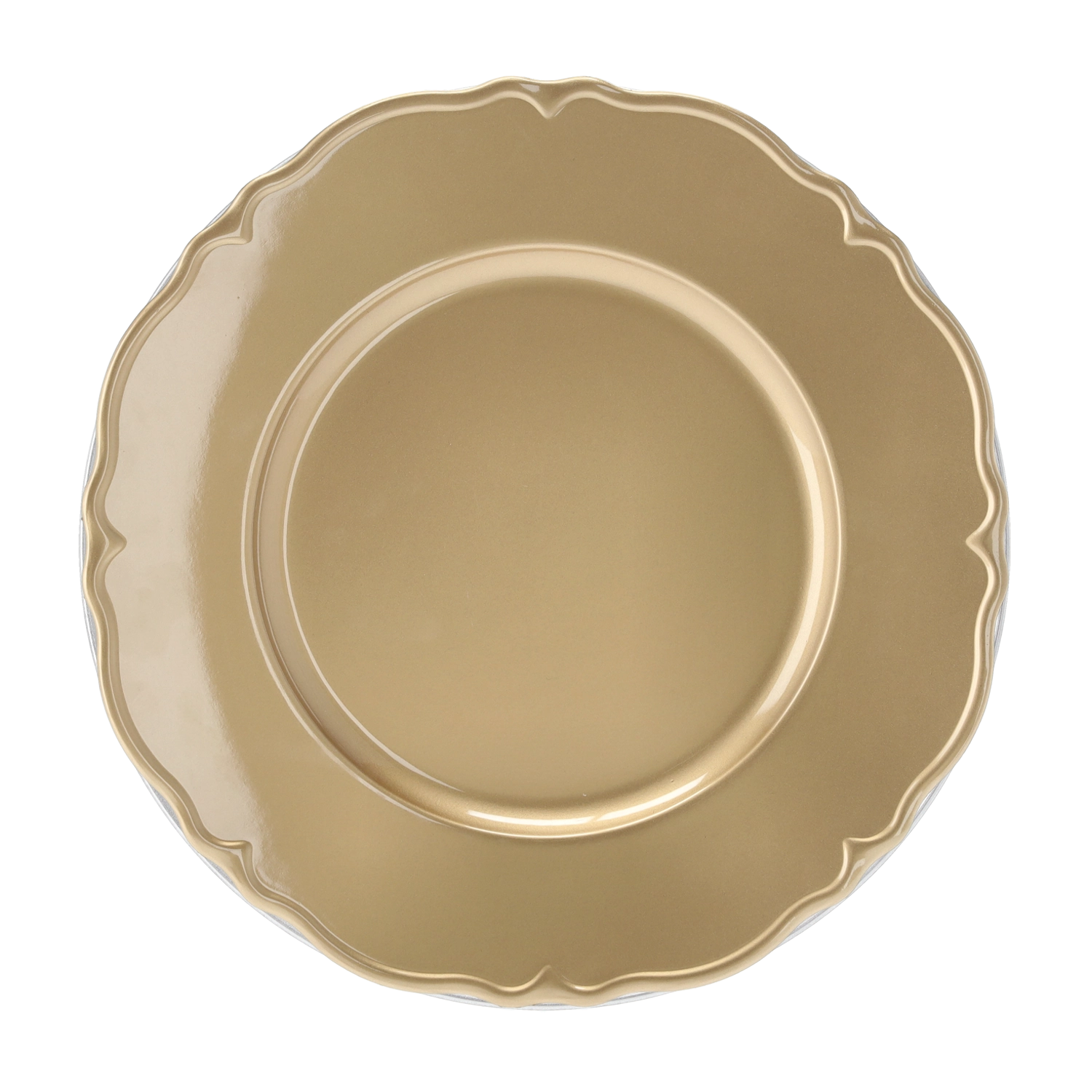 Une assiette de présentation dorée stylée est un excellent choix pour un dressage de table représentatif. La finition dorée brillante et le bord décoratif en relief mettent en valeur assiettes et verres et créent une apparence harmonieuse et luxueuse.
