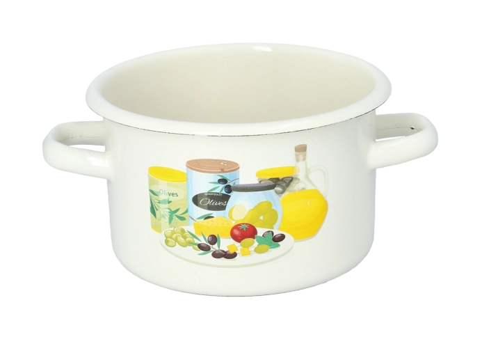 Découvrez une casserole émaillée polyvalente de 2 litres, parfaite pour préparer des soupes, des sauces ou réchauffer de petites portions. Sa surface émaillée de qualité est hygiénique, facile à nettoyer et résistante aux rayures. La finition crème avec motif olives apporte style et fraîcheur à votre cuisine.