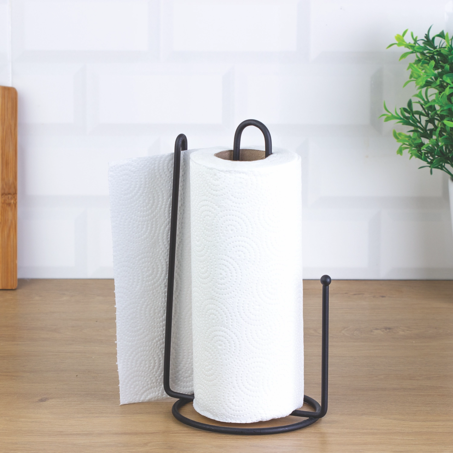 Support en métal élégant pour essuie-tout en noir mat avec détail en bambou, alliant durabilité, stabilité et style industriel moderne. Grâce à sa base ronde stable et à sa conception bien pensée, il permet un détachement facile à une main et accueille sans problème les rouleaux d’essuie-tout standard.