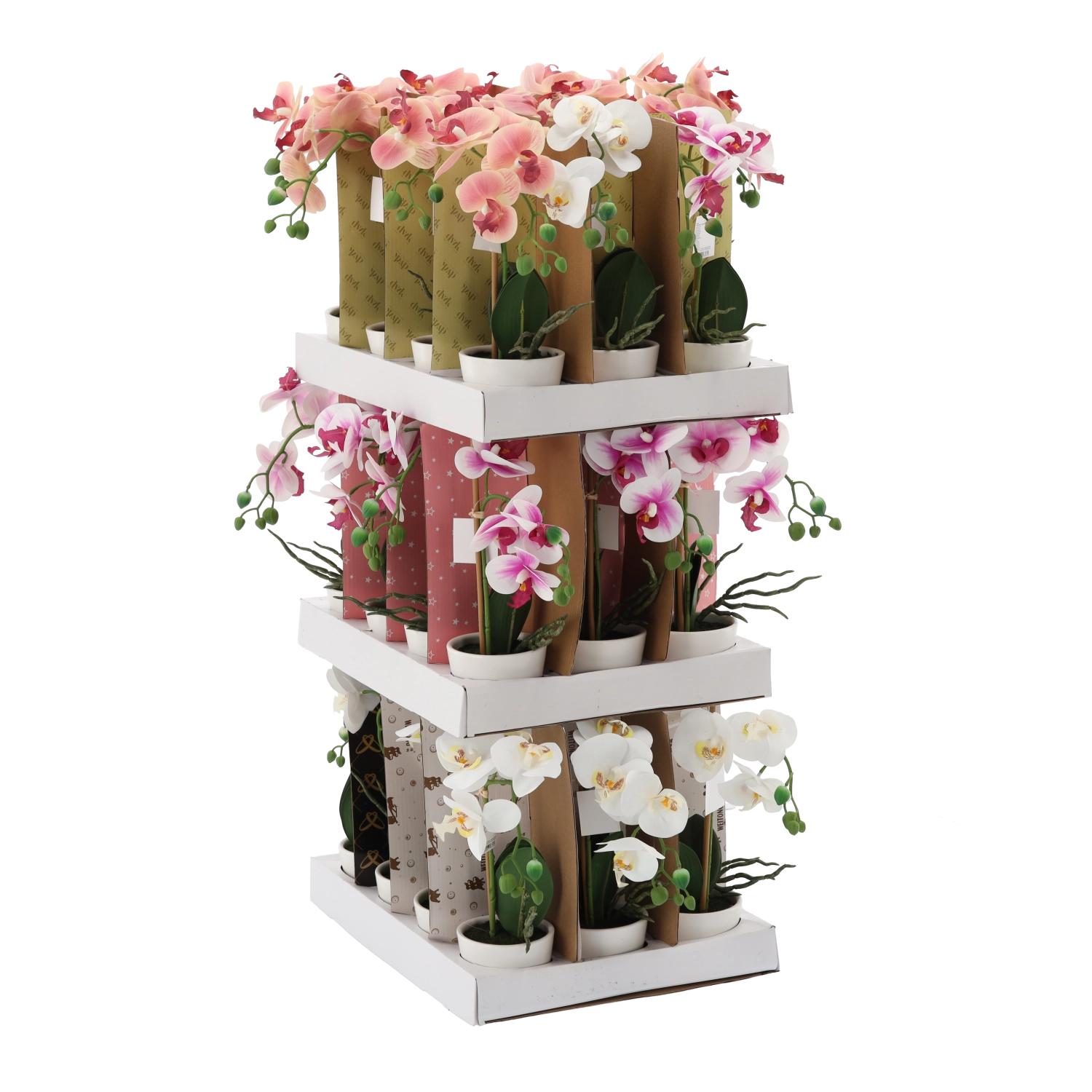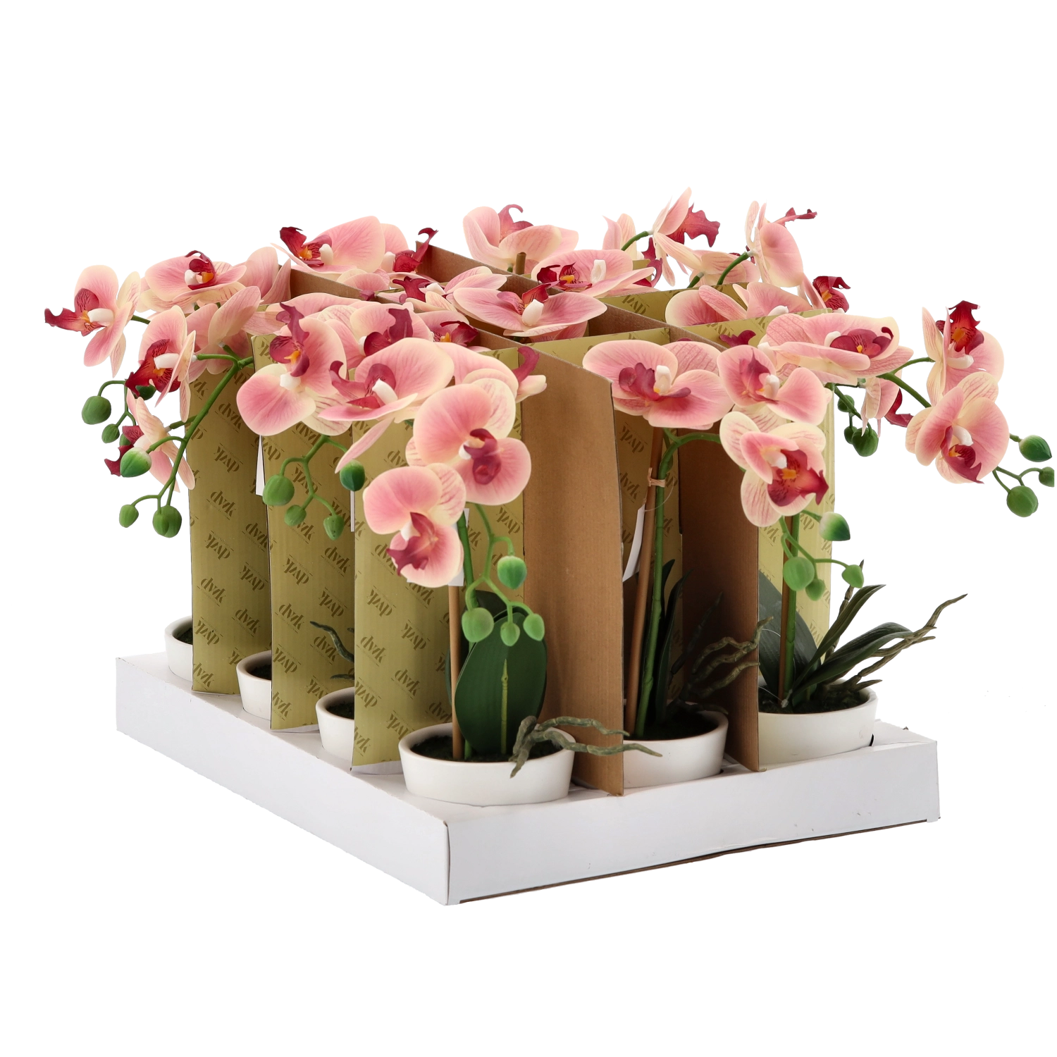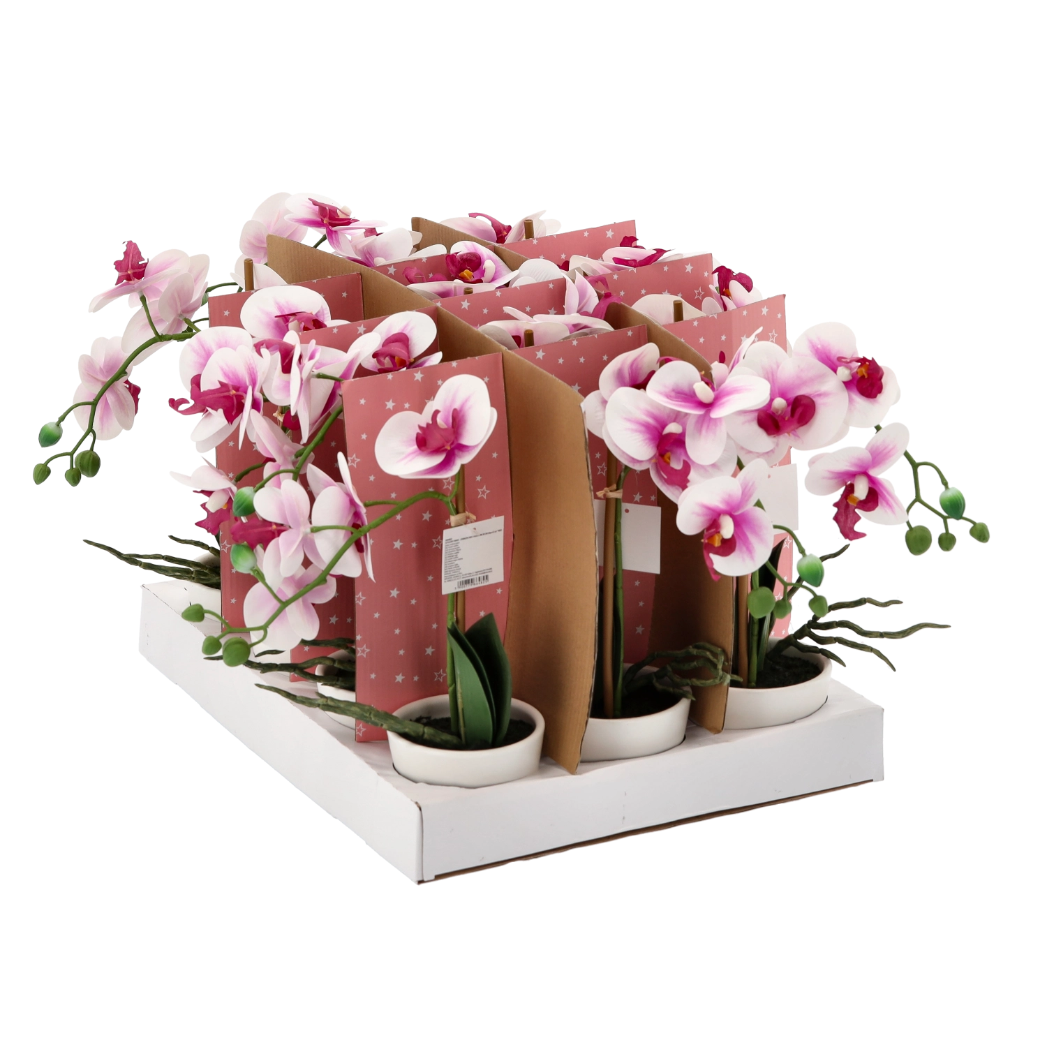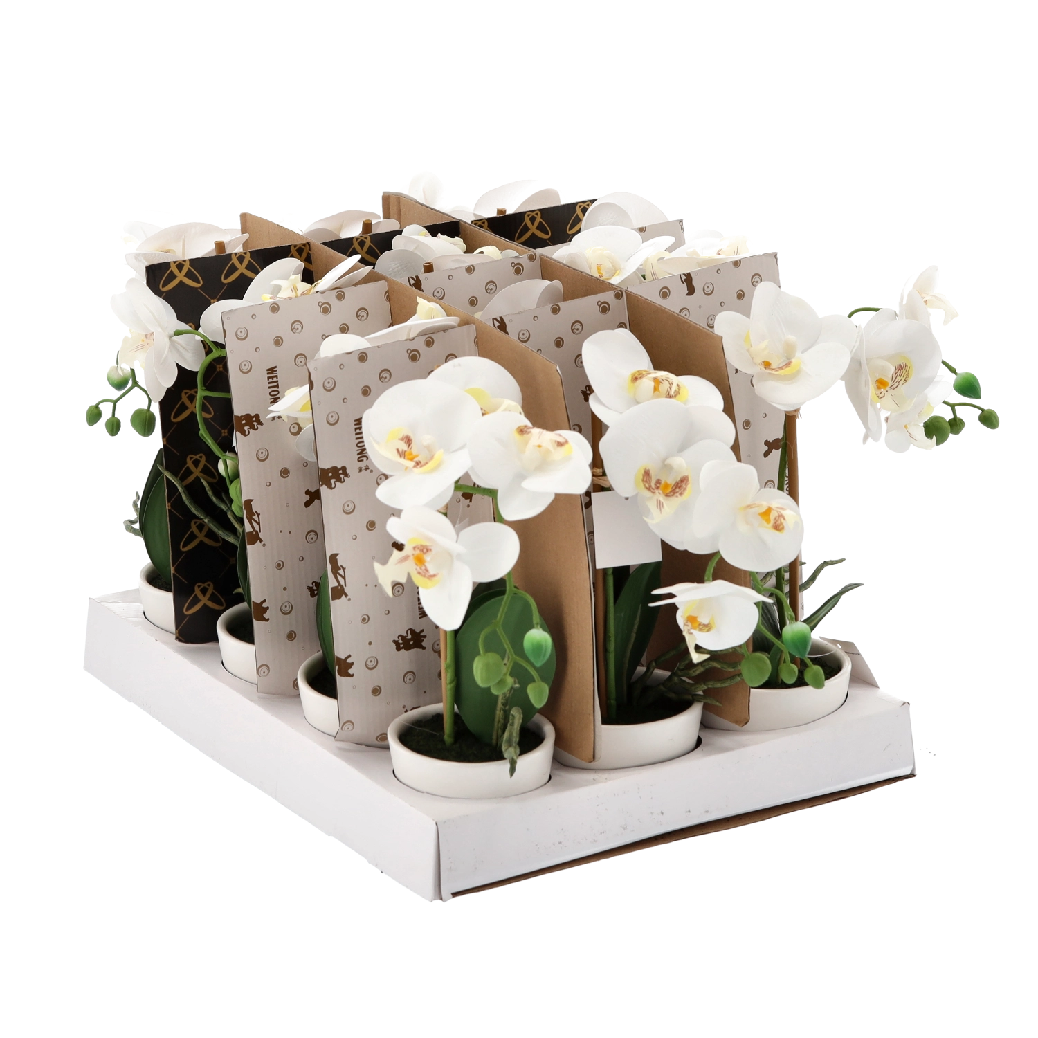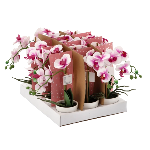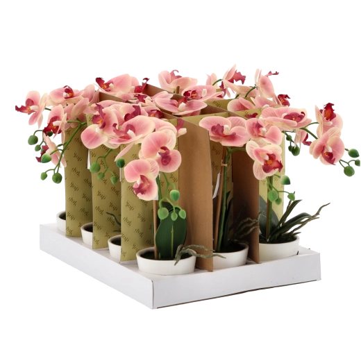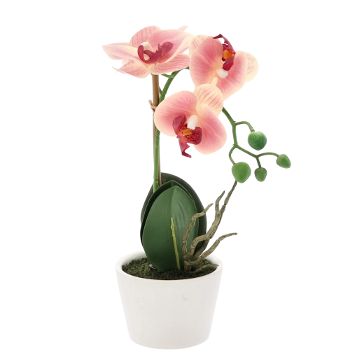 Des fleurs, des boutons et des feuilles finement travaillés créent l’apparence naturelle d’une orchidée qui conserve sa beauté toute l’année sans arrosage ni soins particuliers.