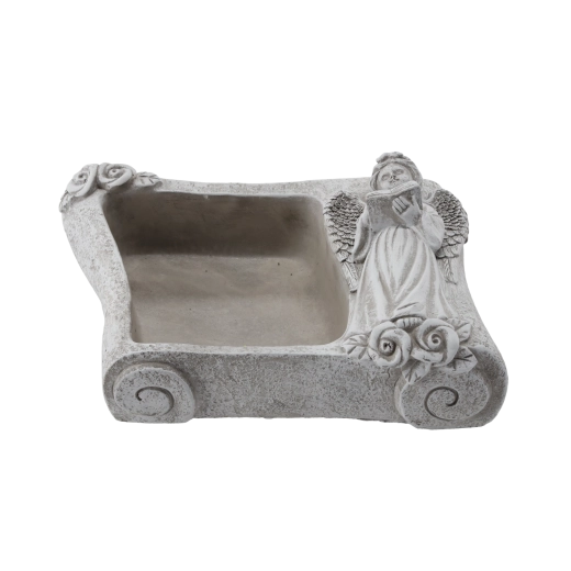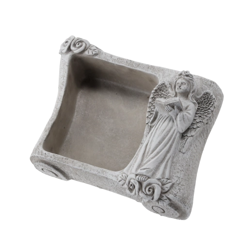 Élégante coupe décorative en forme de livre avec figurine d’ange, idéale pour les compositions funéraires comme pour la déco intérieure. Fabriquée en ciment résistant de couleur grise, sans trou de drainage. Parfaite pour de petites plantes, des bougies, ou pour déposer clés et bijoux. Elle met en valeur le souvenir des proches et apporte un charme classique, de délicats détails de roses et une allure minérale intemporelle.
