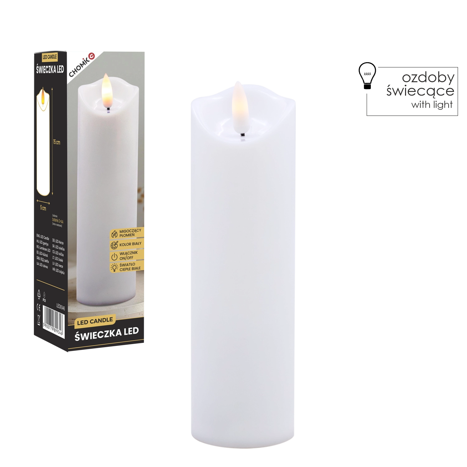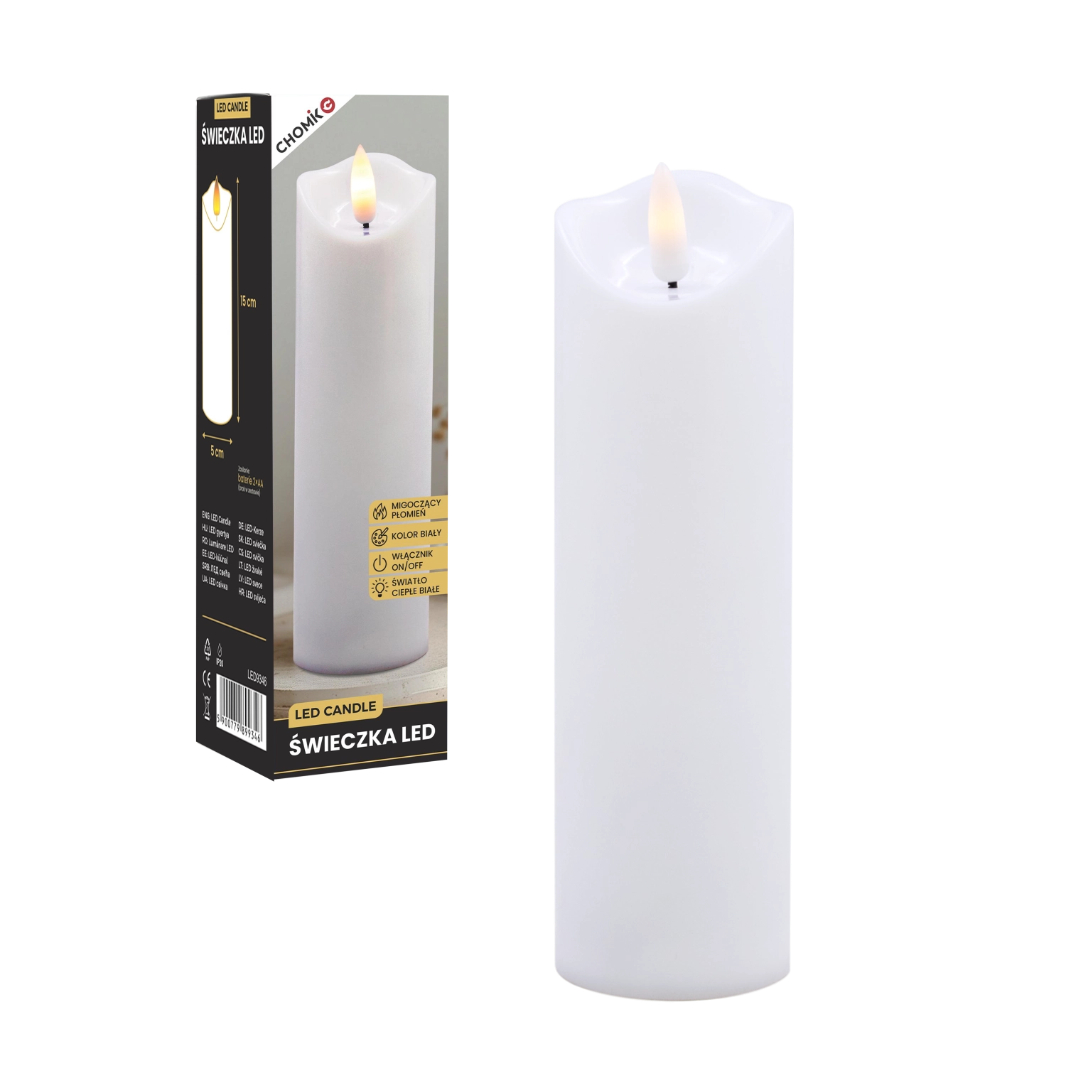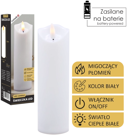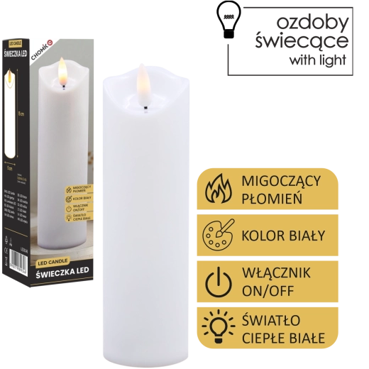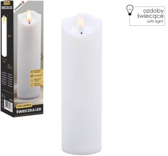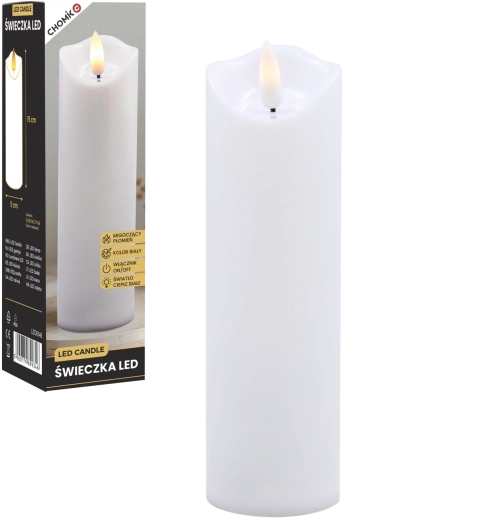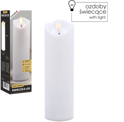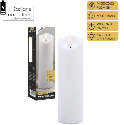Élégante bougie LED blanche avec une flamme chaude vacillante créant une atmosphère chaleureuse sans fumée ni saletés. Peut être utilisée comme décoration intérieure ou comme insert à glisser dans un lampion ou une lanterne. Alimentation par 2× piles AA (non incluses) et commande On/Off simple pour une utilisation pratique.
