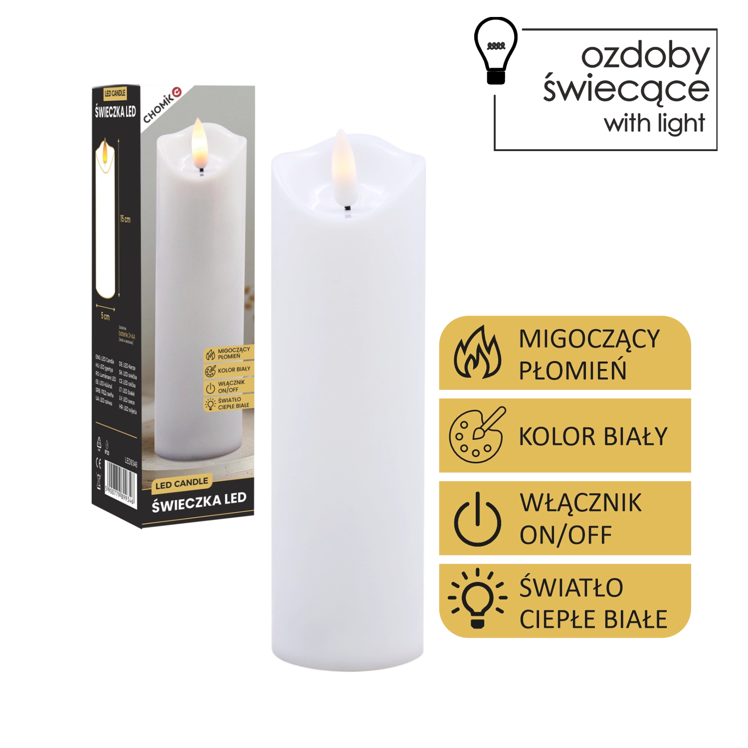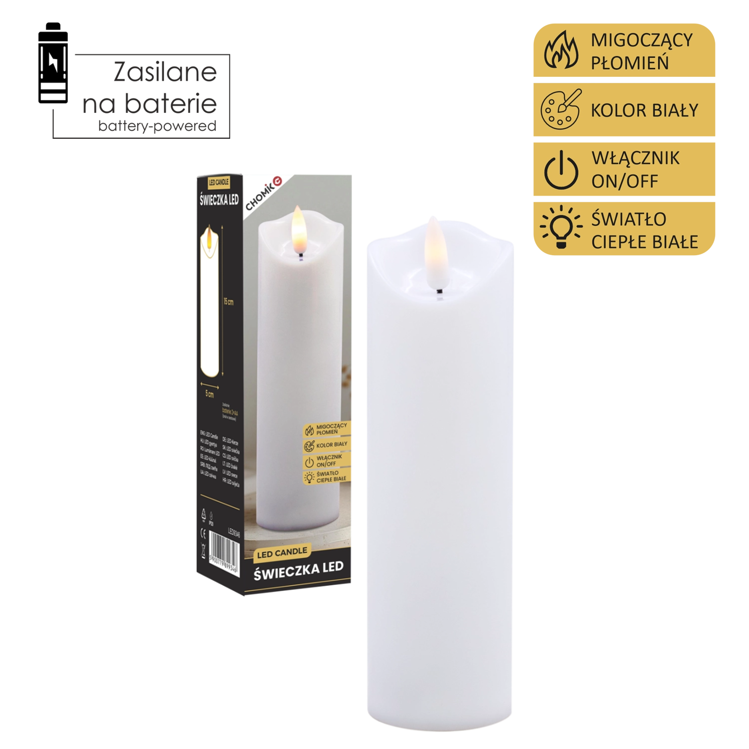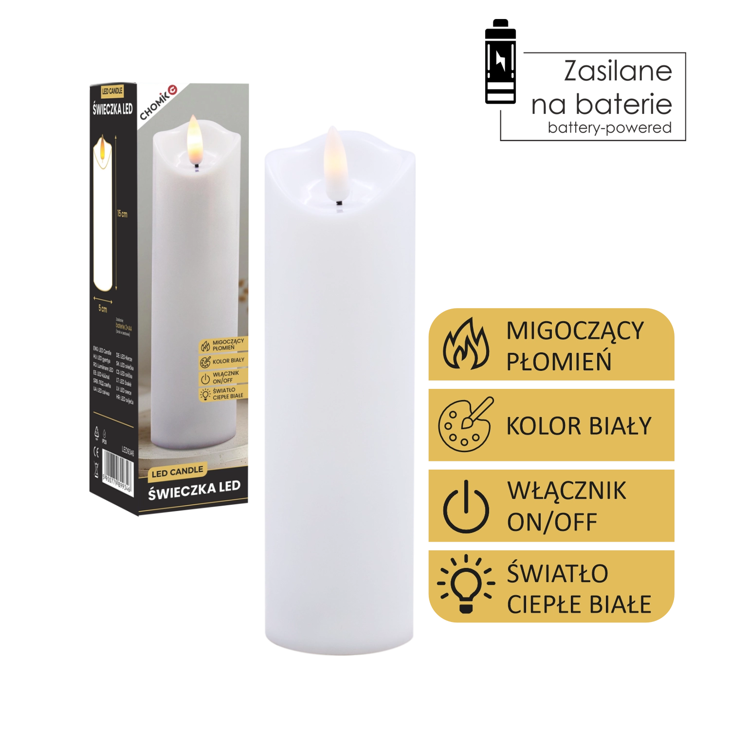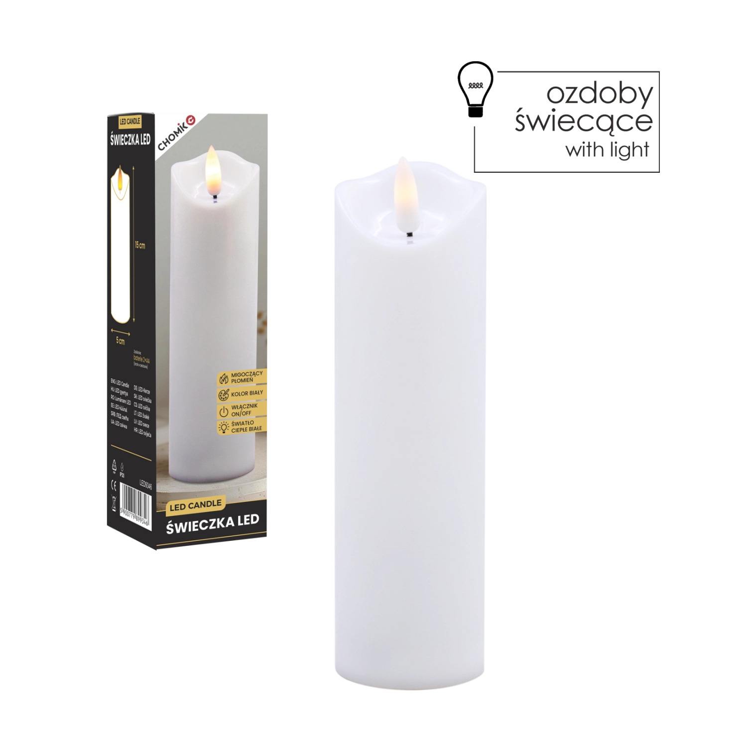 Élégante bougie LED blanche avec une flamme chaude vacillante créant une atmosphère chaleureuse sans fumée ni saletés. Peut être utilisée comme décoration intérieure ou comme insert à glisser dans un lampion ou une lanterne. Alimentation par 2× piles AA (non incluses) et commande On/Off simple pour une utilisation pratique.