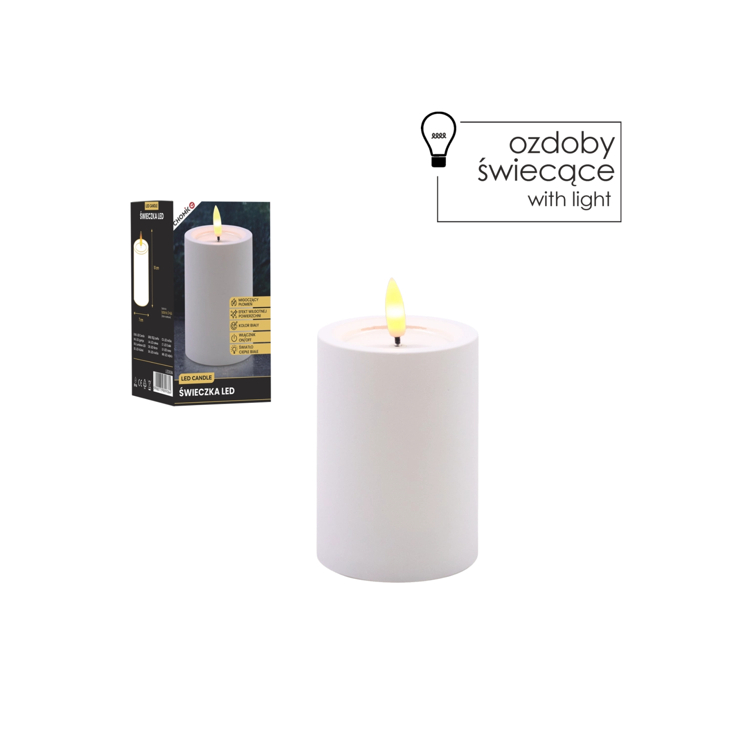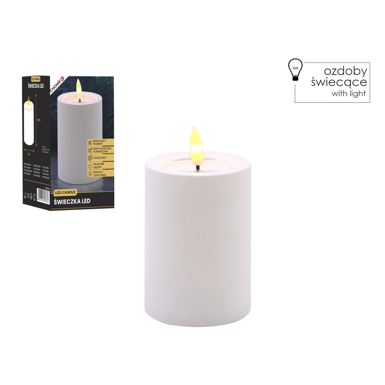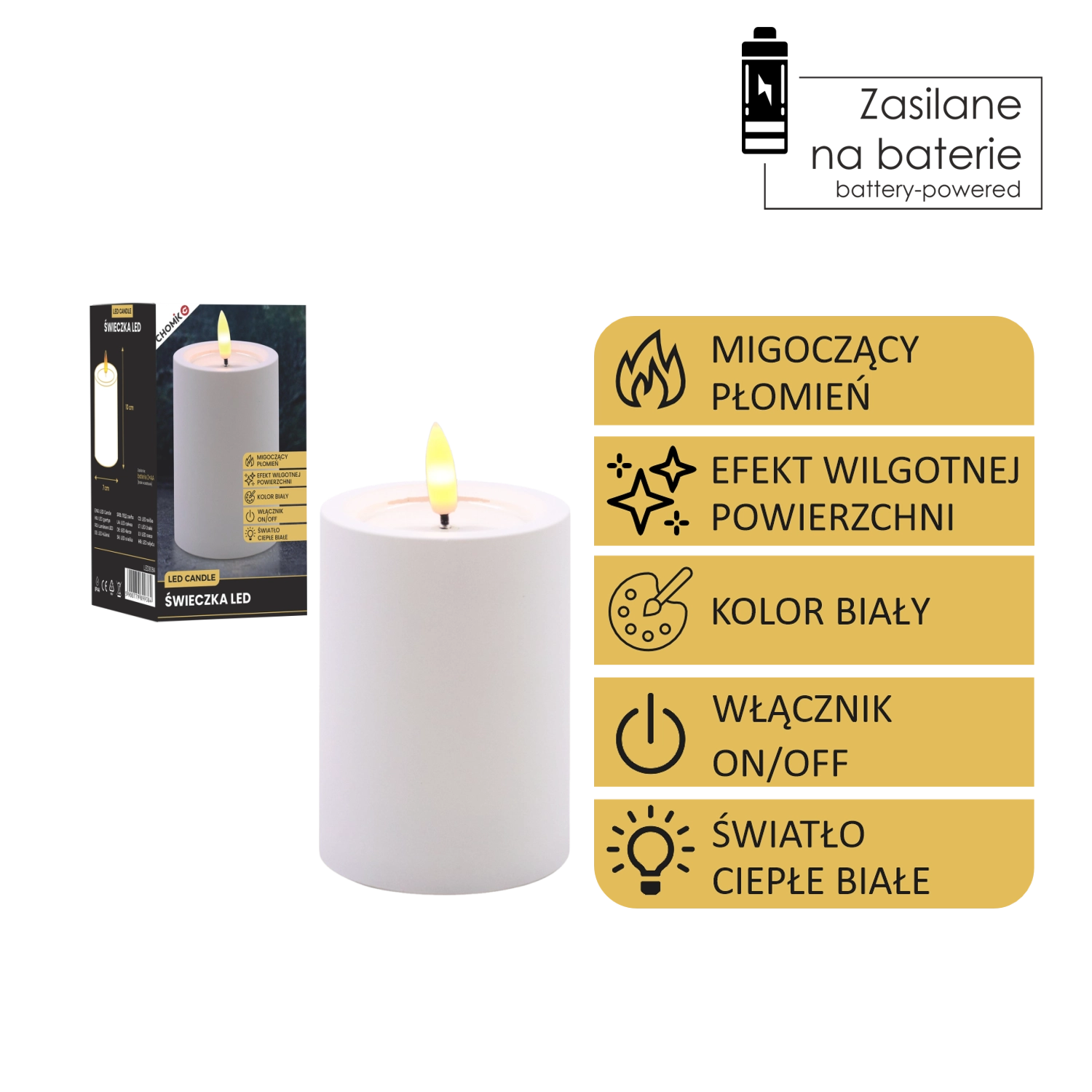 Bougie LED décorative de couleur blanche, dimensions 7 × 10 cm, offrant une lumière sûre et chaleureuse avec une flamme vacillante blanc chaud. Elle présente un effet réaliste de bord supérieur humide, idéale pour le salon, la chambre ou la table de fête. Sans flamme ni fumée, facilement contrôlable par l’interrupteur On/Off, alimentée par 2× piles AA (non incluses).