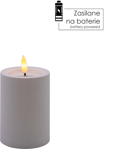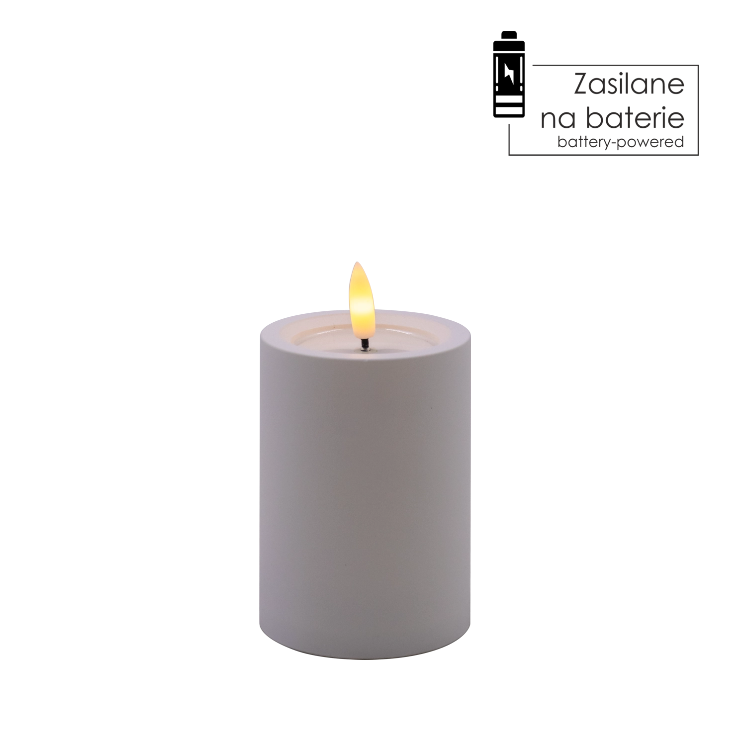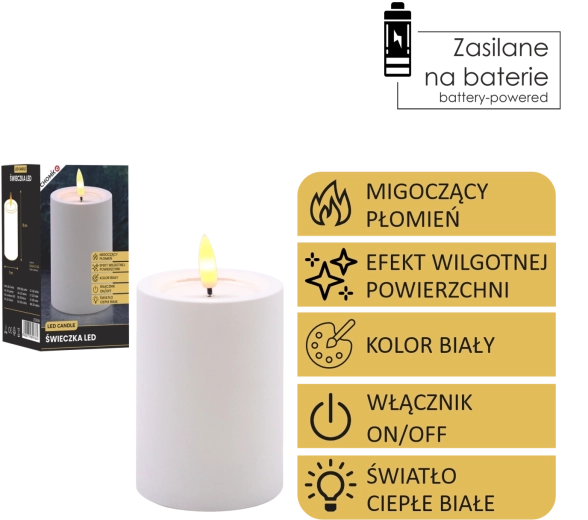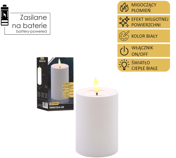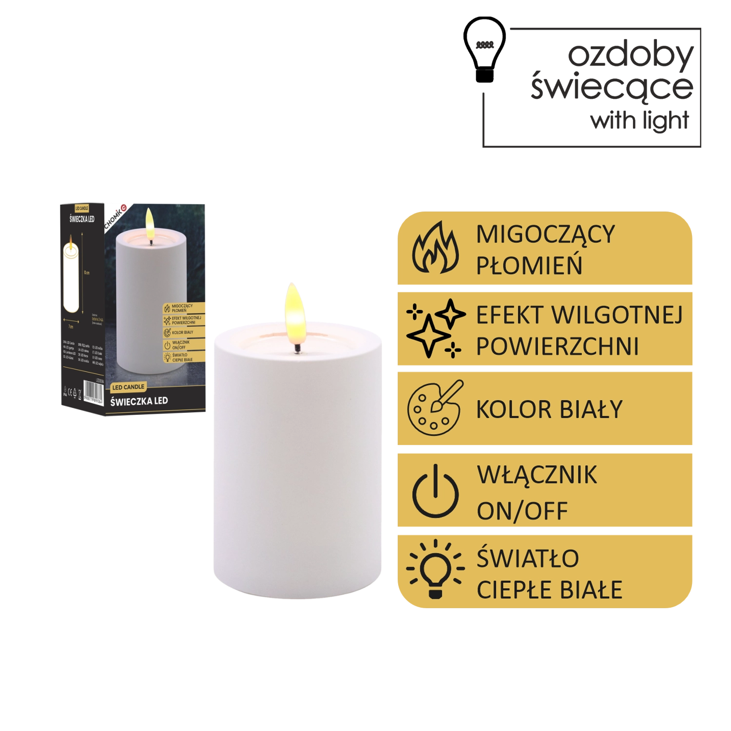Bougie LED décorative de couleur blanche, dimensions 7 × 10 cm, offrant une lumière sûre et chaleureuse avec une flamme vacillante blanc chaud. Elle présente un effet réaliste de bord supérieur humide, idéale pour le salon, la chambre ou la table de fête. Sans flamme ni fumée, facilement contrôlable par l’interrupteur On/Off, alimentée par 2× piles AA (non incluses).